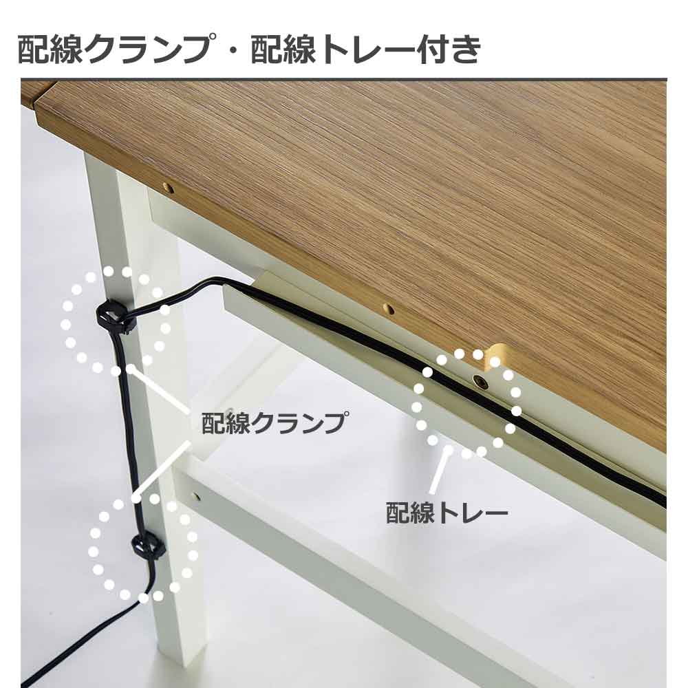 天板後ろの背面には配線トレー、脚部背面には配線クランプを設置。パソコンやデスクライトなどの配線をきれいに整理できます。