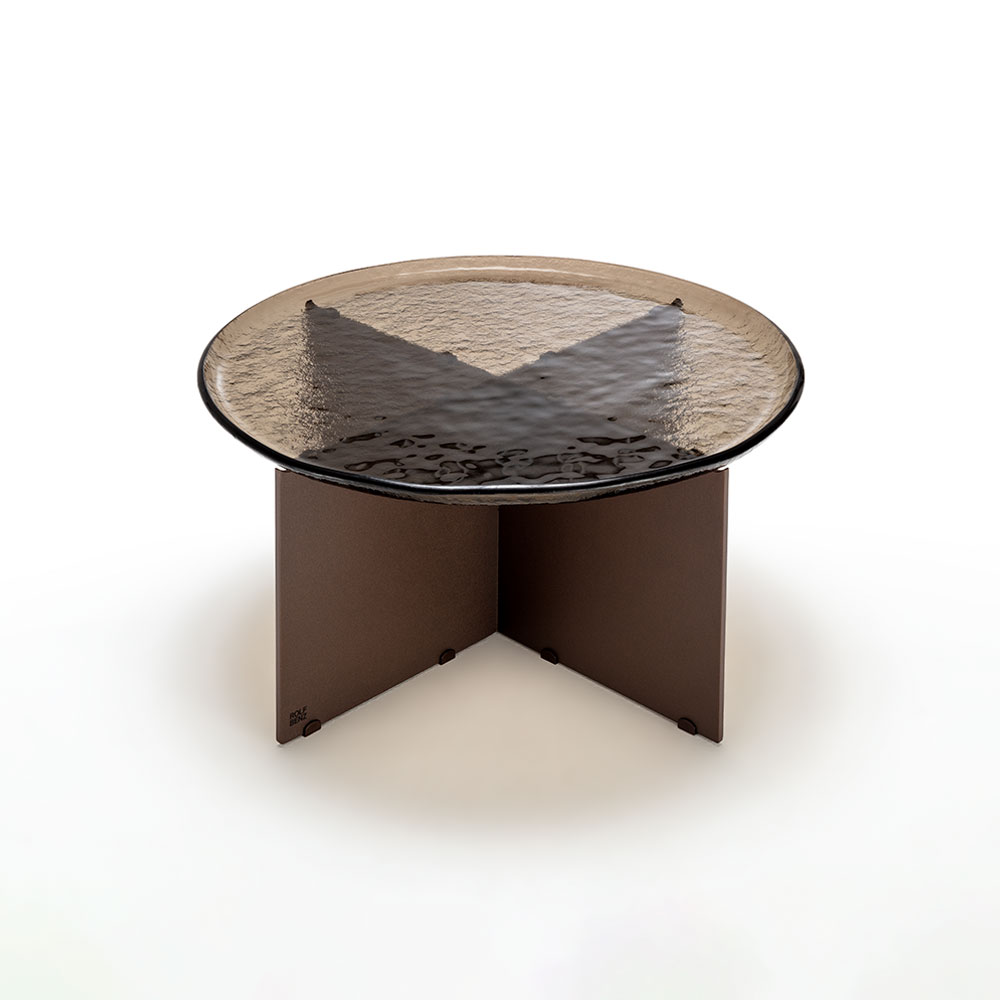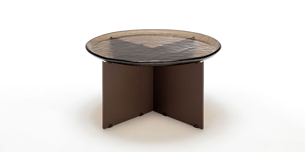 凹凸のあるガラストップは、一つ一つ個性があり同じものがないため、特別感とオブジェのような存在感を演出します。有機的なフォルムのガラストップとシンプルで無機質なスチール脚のコントラストが美しいテーブルです。