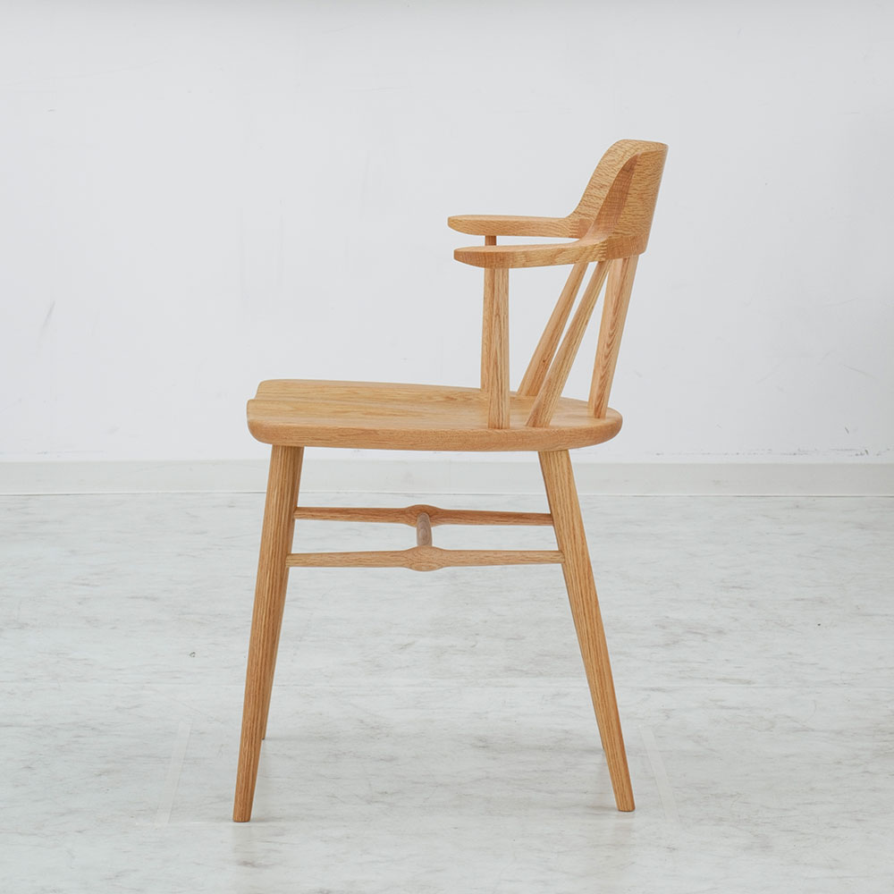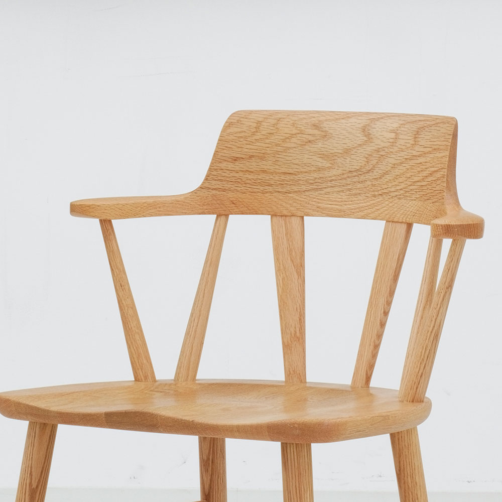 背当たり部(笠木部)は曲木技術で無垢を曲げ、背にぴったり合うように削り出しています。なめらかな曲線で仕上げた短めのひじ掛けは、自然な角度で腕をあずけて心地良くくつろぐことができます。