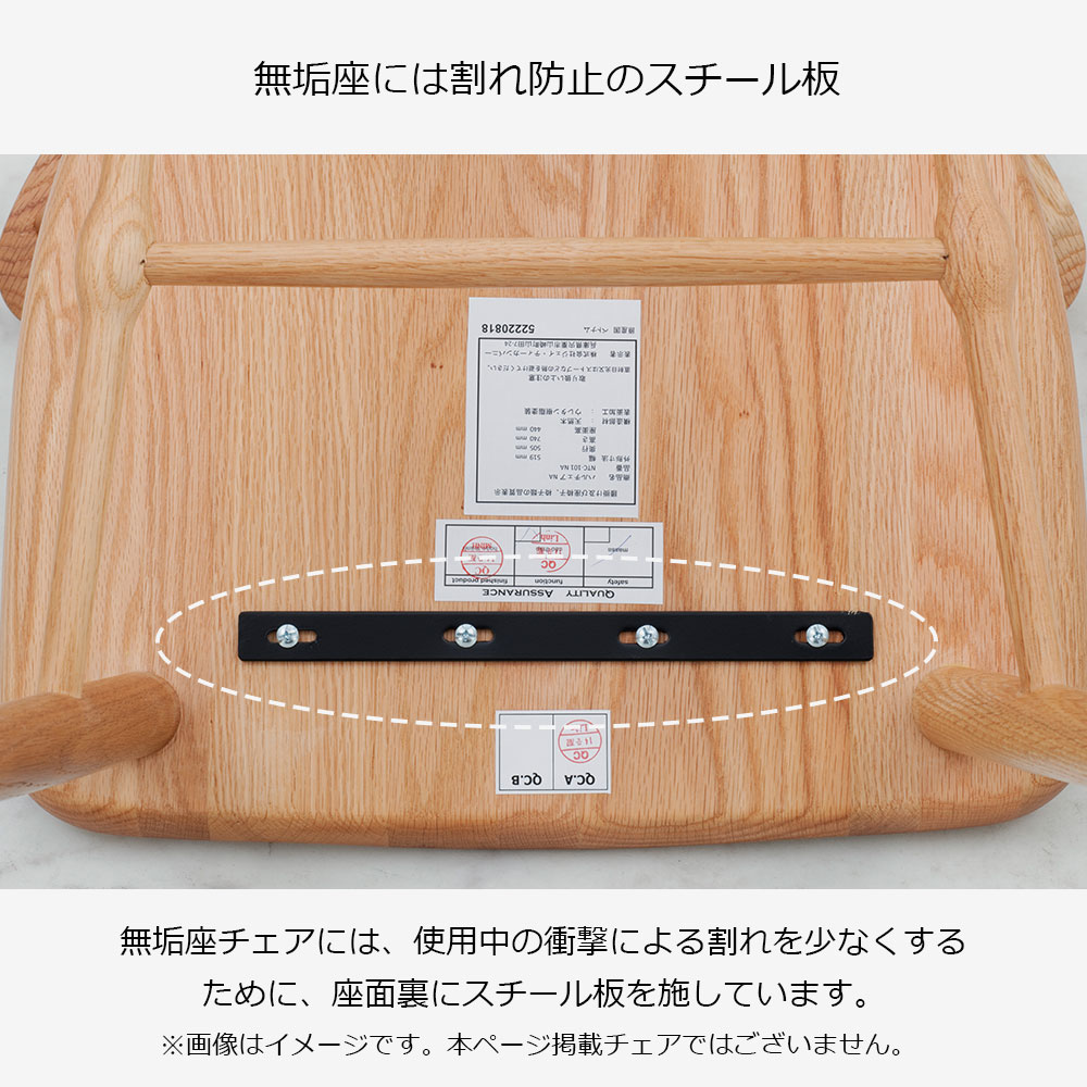 無垢座チェアは、使用中の衝撃による割れを少なくするために、座面裏に割れ防止のスチール板を施しています。