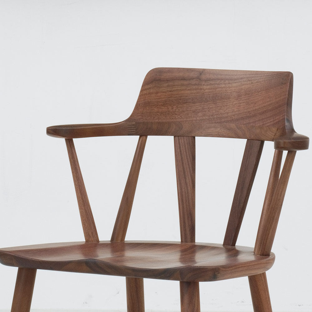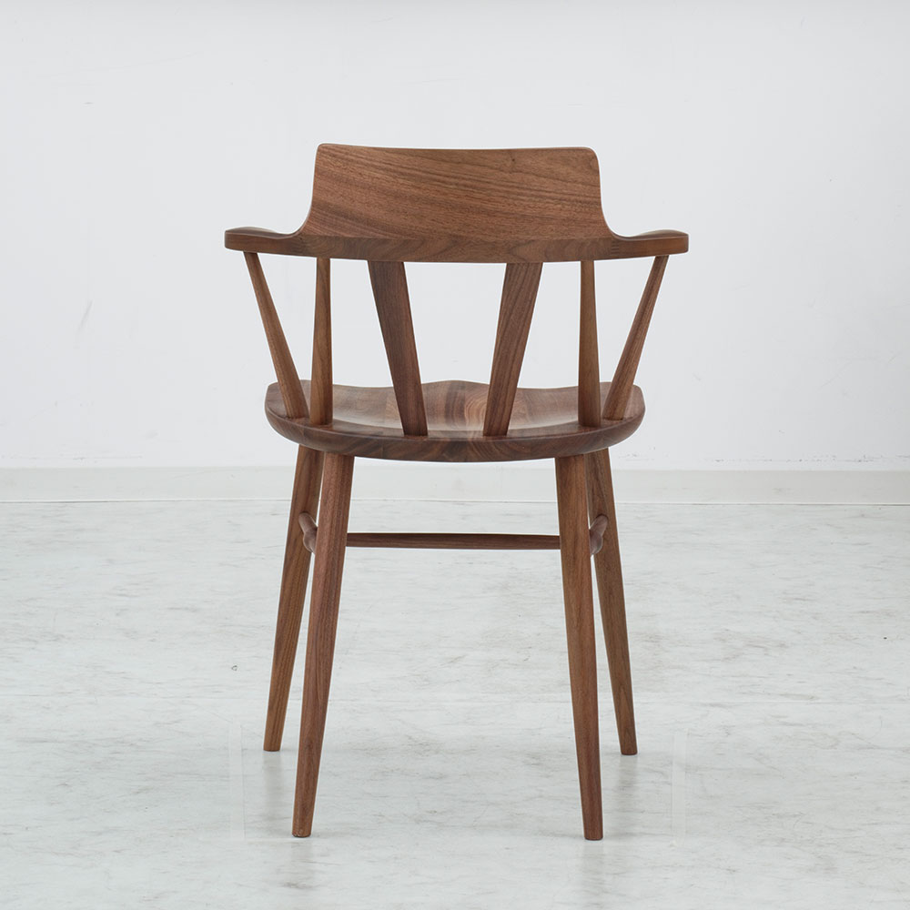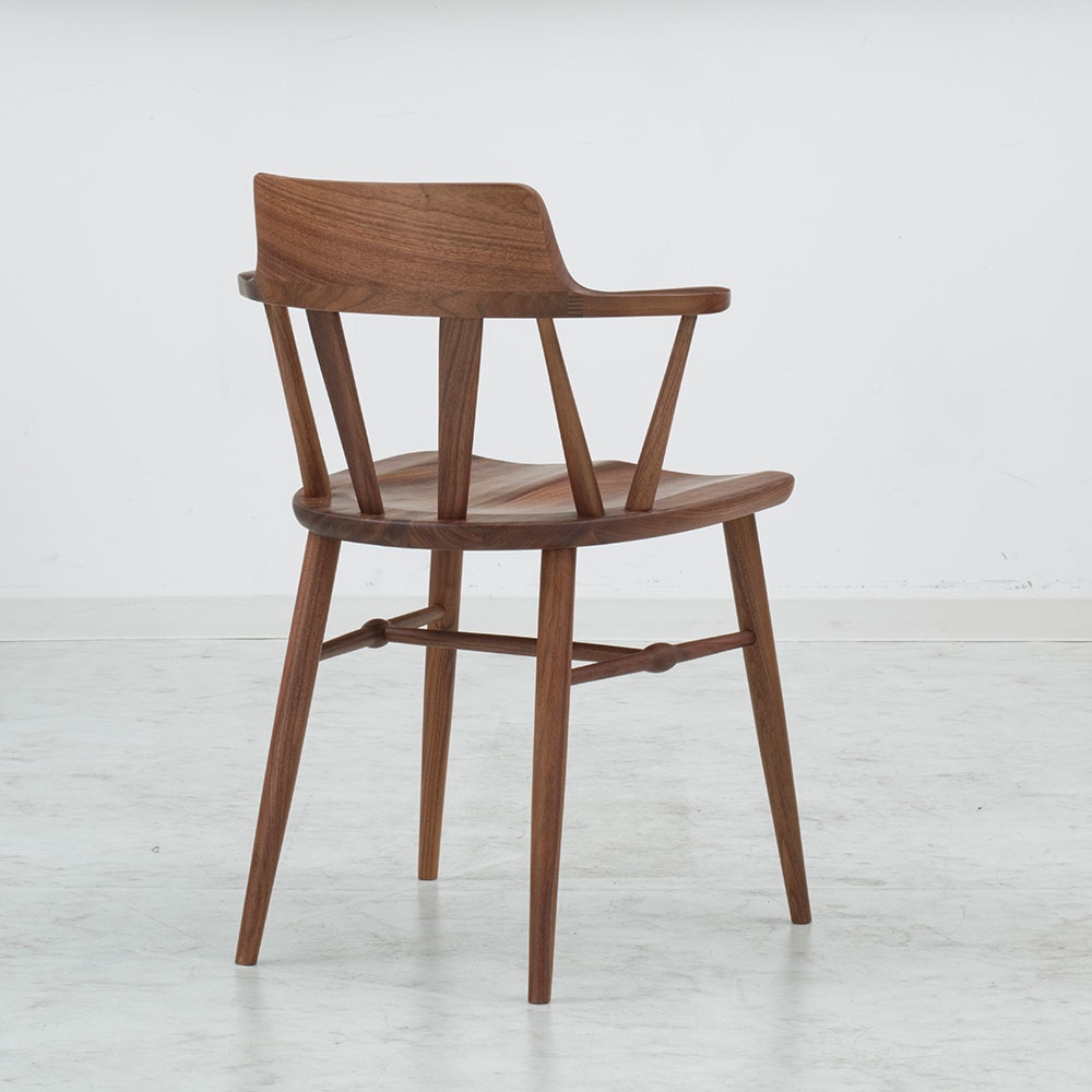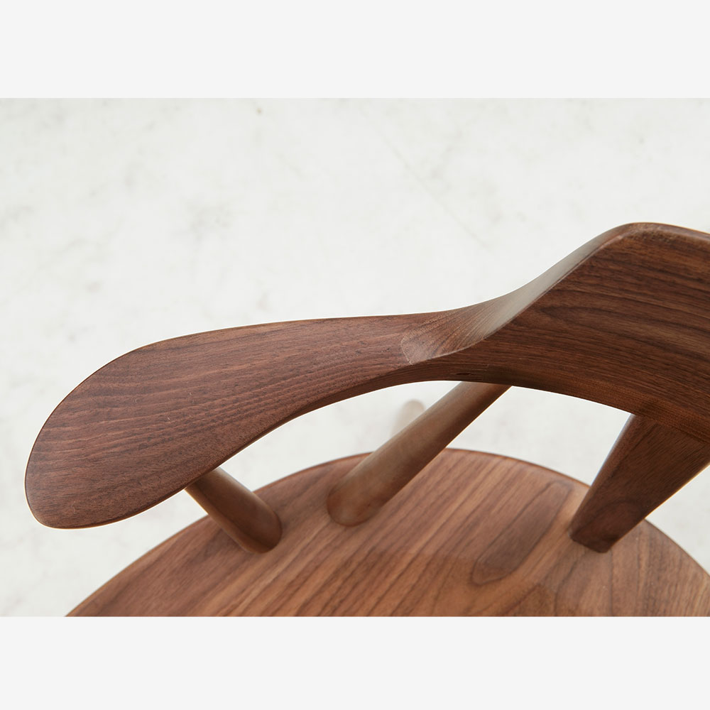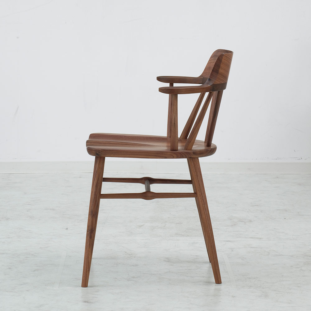 背当たり部(笠木部)は曲木技術で無垢を曲げ、背にぴったり合うように削り出しています。なめらかな曲線で仕上げた短めのひじ掛けは、自然な角度で腕をあずけて心地良くくつろぐことができます。
