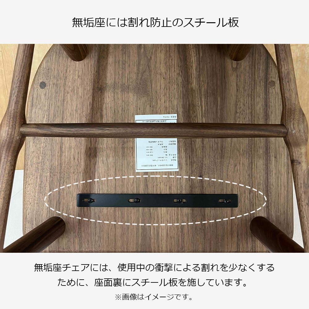 無垢座チェアは、使用中の衝撃による割れを少なくするために、座面裏に割れ防止のスチール板を施しています。