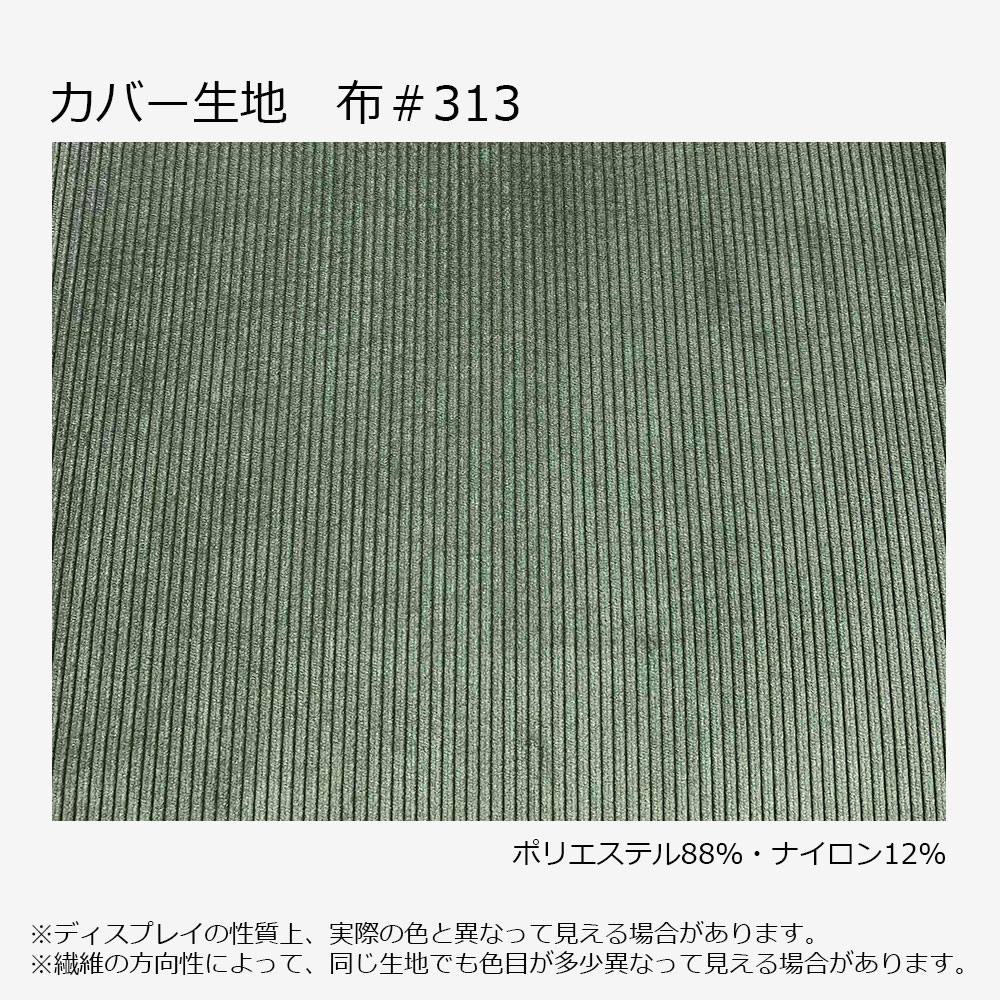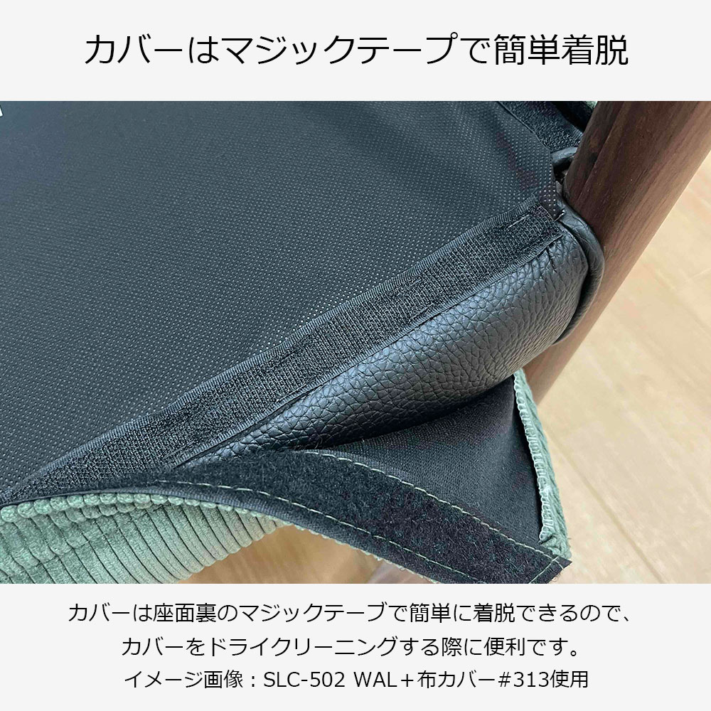 お好みで専用の布カバーを着けることができます。なめらかな肌触りとグリーンのコーデュロイ生地で優しい印象に。カバーは座面裏のマジックテーブで簡単に着脱でき、ドライクリーニングでお手入れできます。※画像はウォールナット材(WAL)を使用したイメージです。