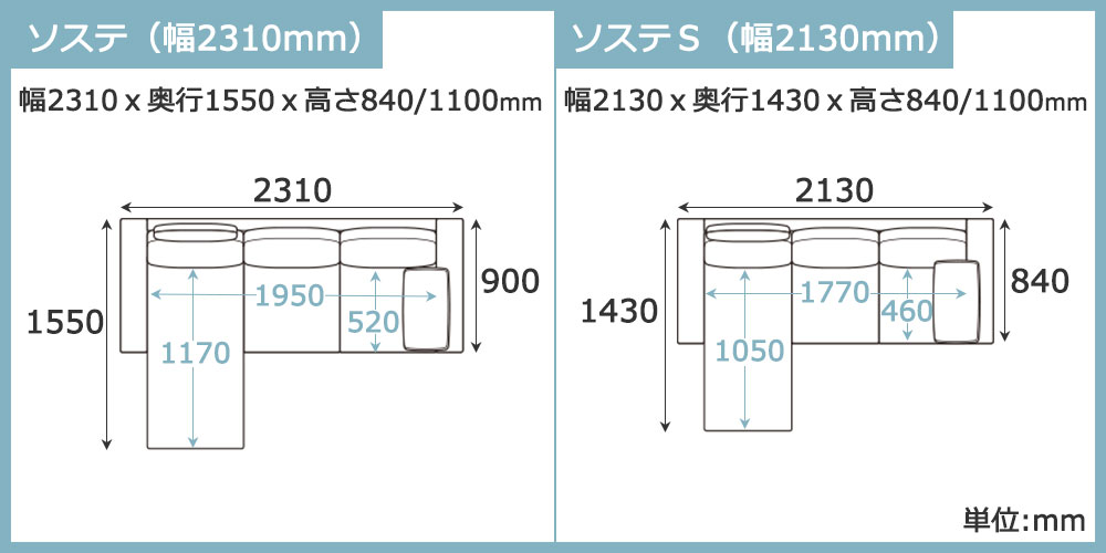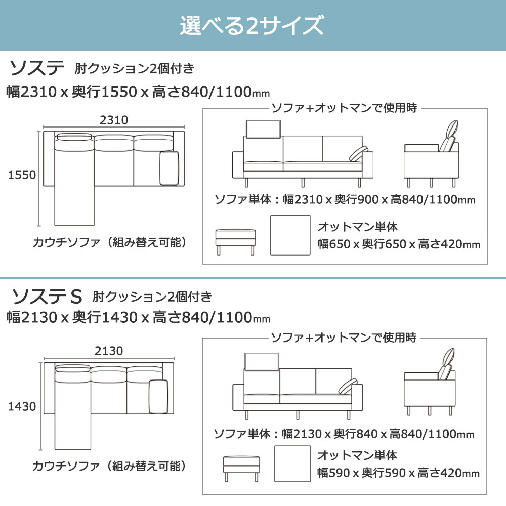 ゆったり座れる幅2310mm(ソステ)とコンパクトサイズに抑えた幅2130mm(ソステS)の2サイズからお選びいただけます。