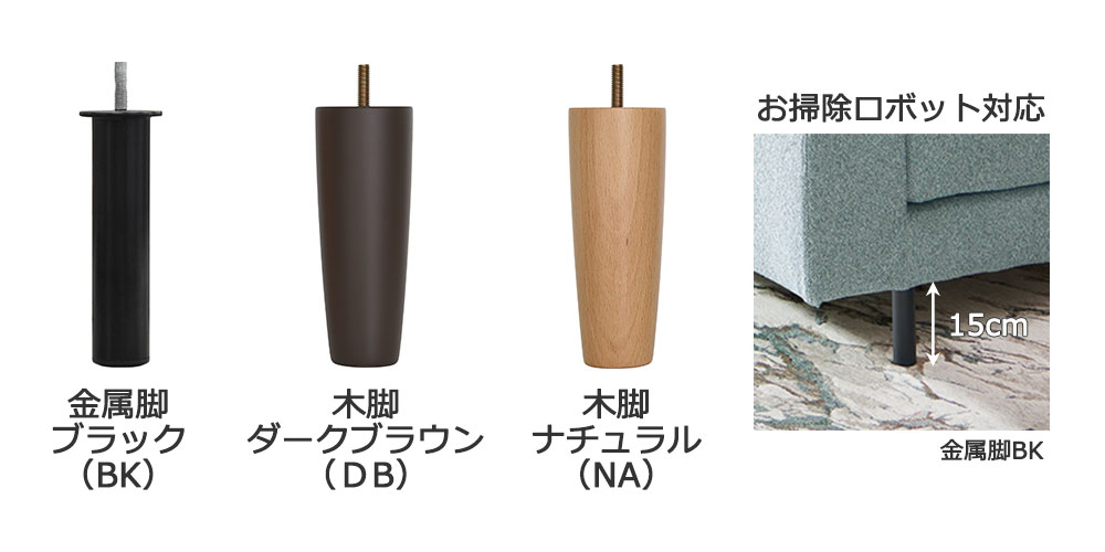 脚は3タイプからお選びいただけます。脚高は15cmあり、お掃除ロボットにも対応しています。