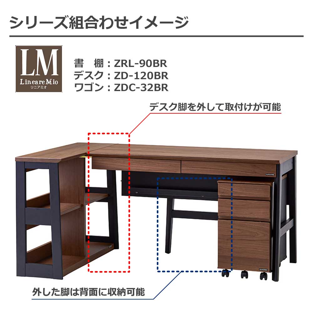 リニアミオ コンポーネントタイプの、書棚(ZRL-90BR)と別売りのデスク(ZD-120BR)・ワゴン(ZDC-32BR)との組合わせイメージです。書棚天板とデスク天板がつながり、天板を広く使える組合わせです。書棚と組合わせる側のデスク脚は外して取付けできるため、足元のものの出し入れもスムーズに行えます。取外した脚はデスク背面に収納できます。