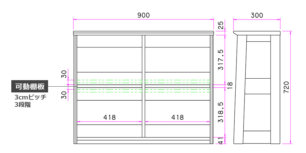 中央の棚板は、3cmピッチ3段階の可動棚板です。上段・下段ともにA4ファイルが収納できます。
