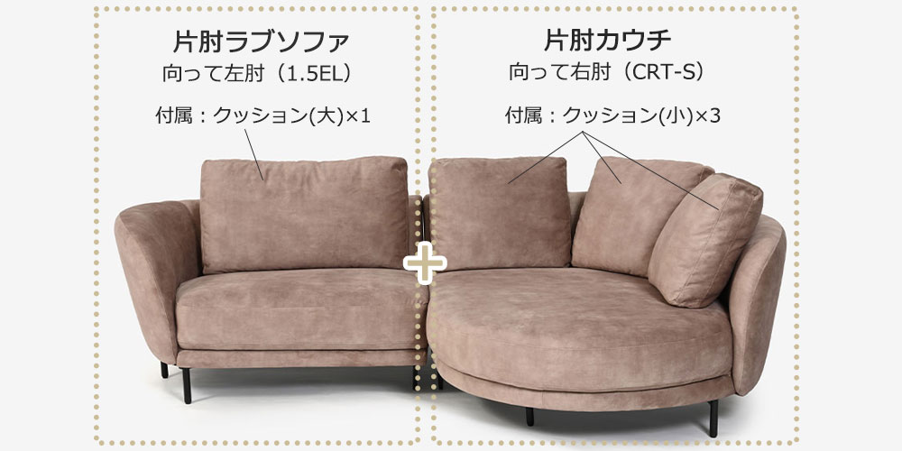 本ページは「片肘ラブソファ 向かって左肘(1.5EL)背クッション大1個付き」+「片肘カウチ 向かって右肘(CRT-S)背クッション小3個付き」を組み合わせたカウチソファです。
