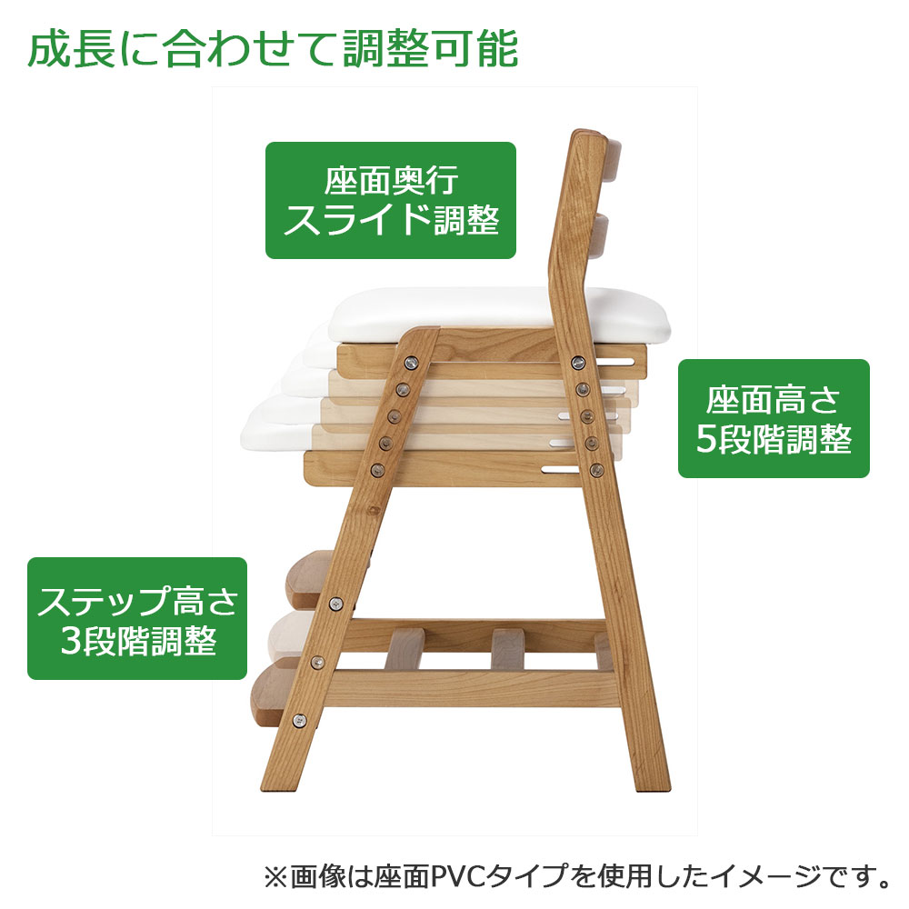 座面奥行は前後スライド仕様で調整可能です。また、座面高は5段階(400/430/460/490/520mm)、ステップ高さは3段階(90/155/220mm)で成長に合わせて調整しながらお使いいただけます。