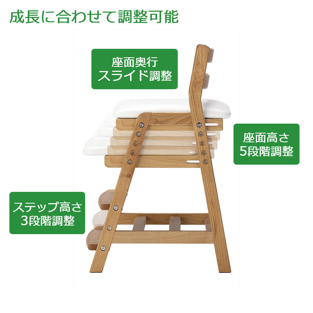 座面奥行は前後スライド仕様で調整可能です。また、座面高は5段階(420/450/480/510/540mm)、ステップ高さは3段階(90/155/220mm)で成長に合わせて調整しながらお使いいただけます。