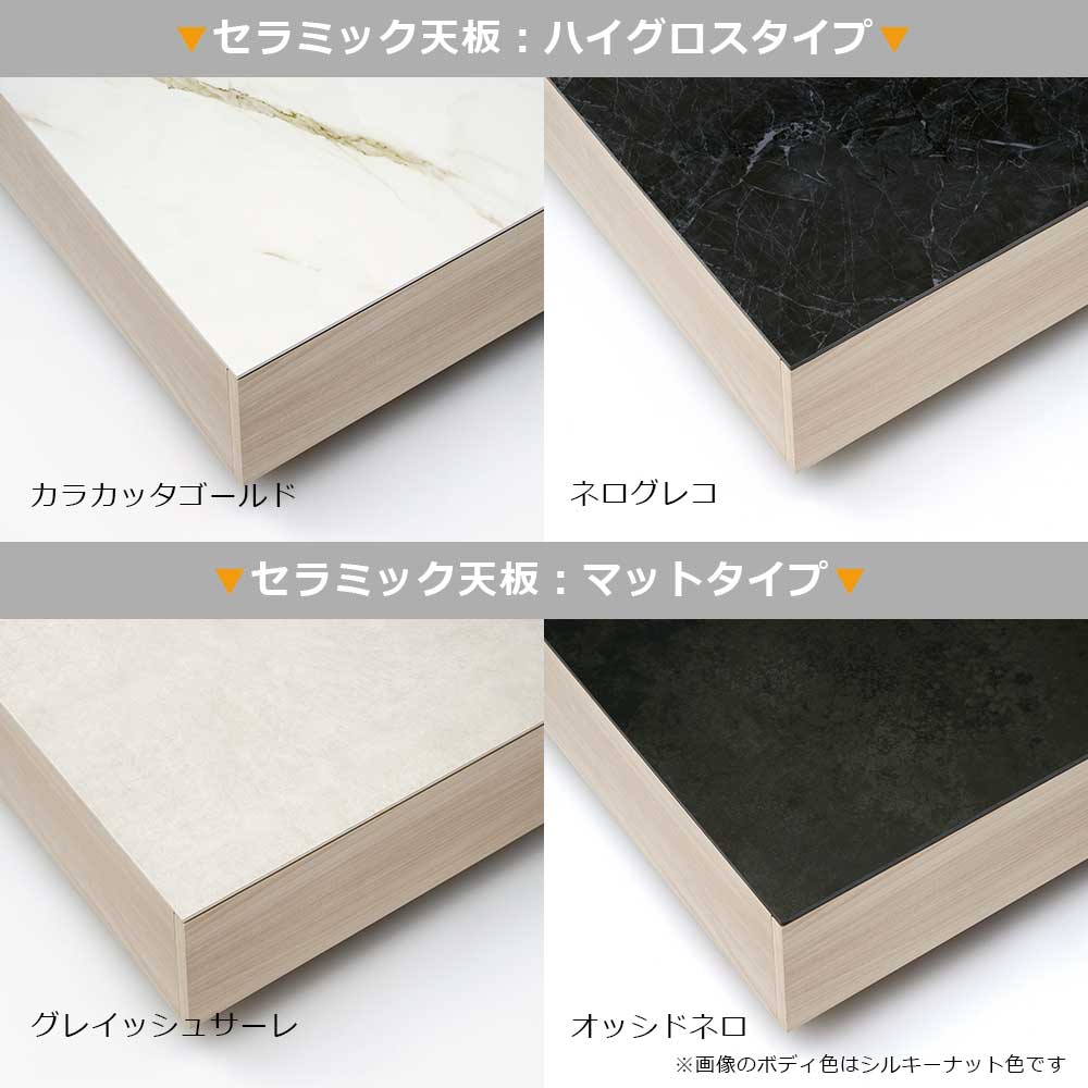 セラミック天板は全4色。ハイグロスタイプのカラカッタゴールド、ネログレコは光沢のある鏡面仕上げの質感、マットタイプのグレイッシュサーレ、オッシドネロは艶を抑えたマットな質感です。