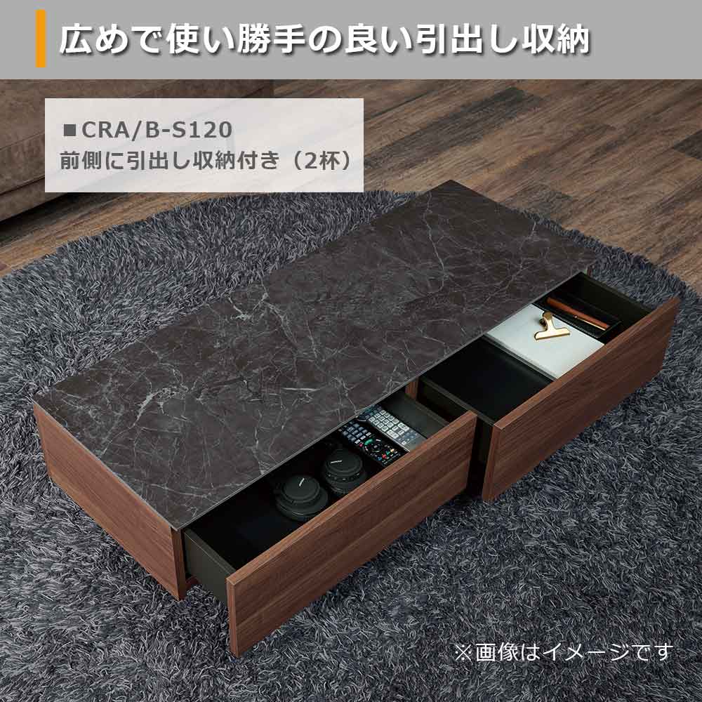 前側に2杯引出し収納があります。使い勝手が良く、リビング周りの小物類を収納できます。引出しは優しく閉まるサイレントレールを採用しています。※画像は「CRA-S120/天板:ネログレコ」のイメージです。