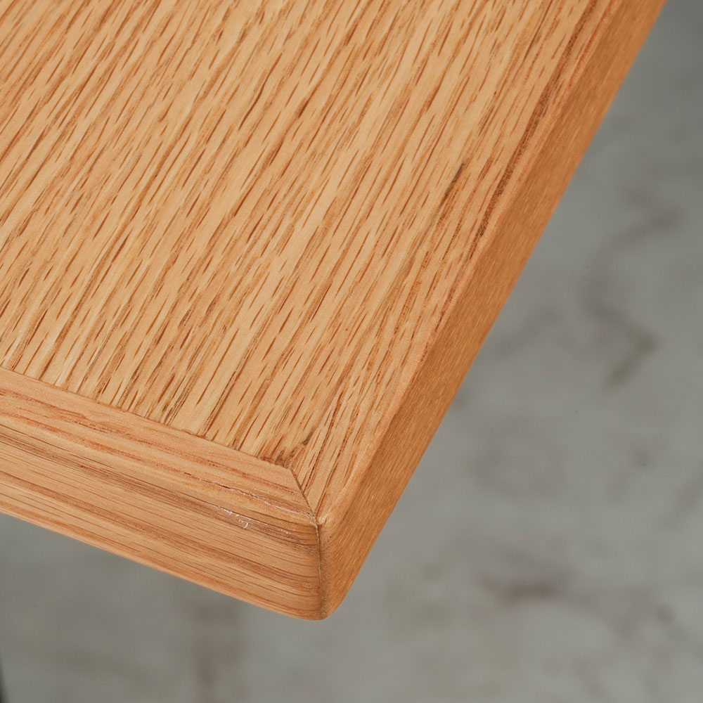天板は、ほんのり赤みを含む柔らかな色味が特長のレッドオーク材の突板仕様で、縁部分は無垢材で仕上げられています。開放感のある明るい雰囲気を演出し、木の優しいぬくもりを感じられます。