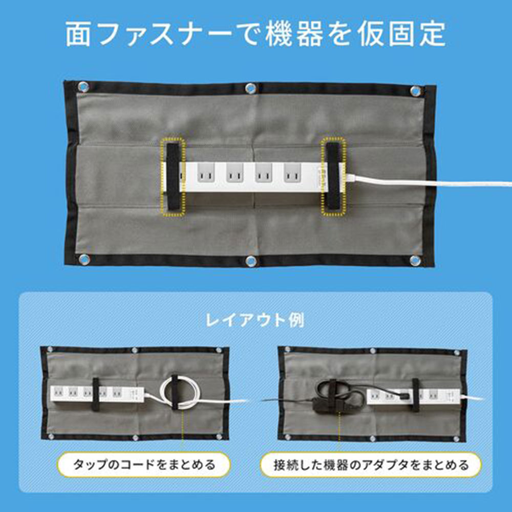 電源タップなどは、位置がすれないようにマジックバンドで固定できます。