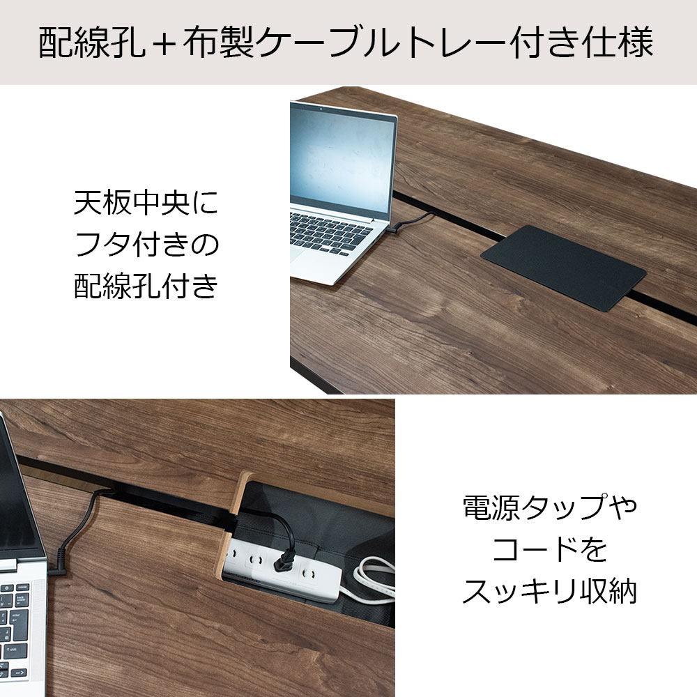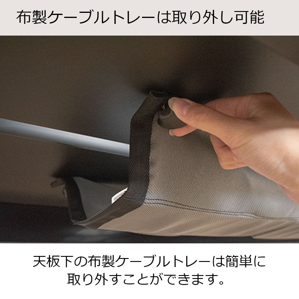 本ページ掲載モデルは、スリットだけでなく、天板中央にフタ付きの「配線孔」と天板下に「布製ケーブルトレー」を備えたオプション仕様です。布製ケーブルトレーには、電源タップやコードを収納しておくことができます。