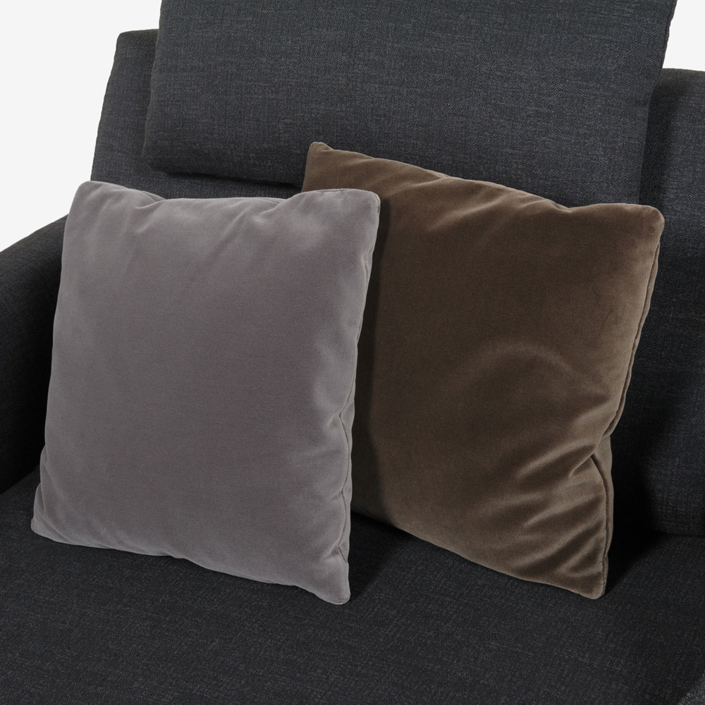ソファ本体の張地と同系色のブラックグレー色のクッション(66cm×40cm)が3個と、艶やかなベロア調のアンブラグレー色とブラウングレー色のクッション(40cm角)が計3個が付属されています。