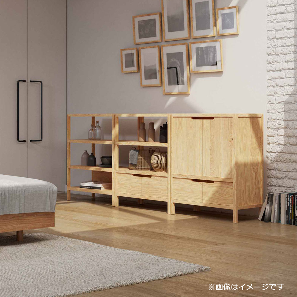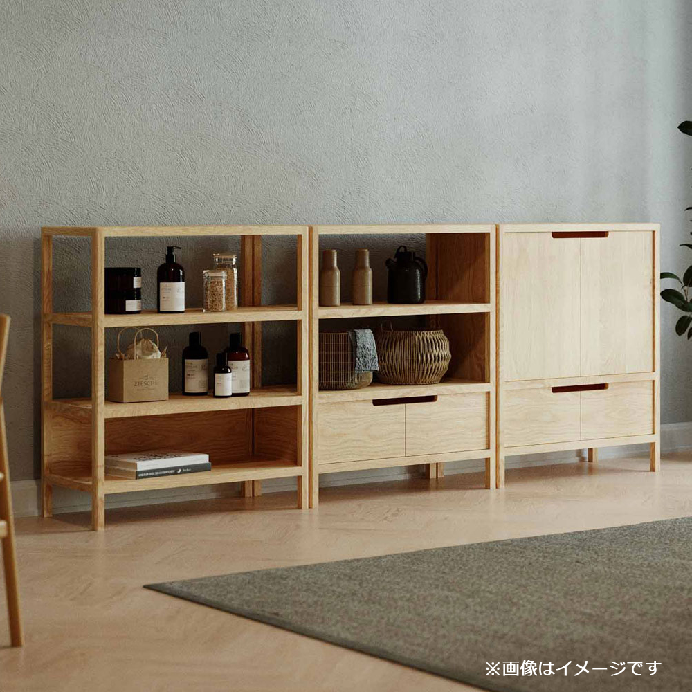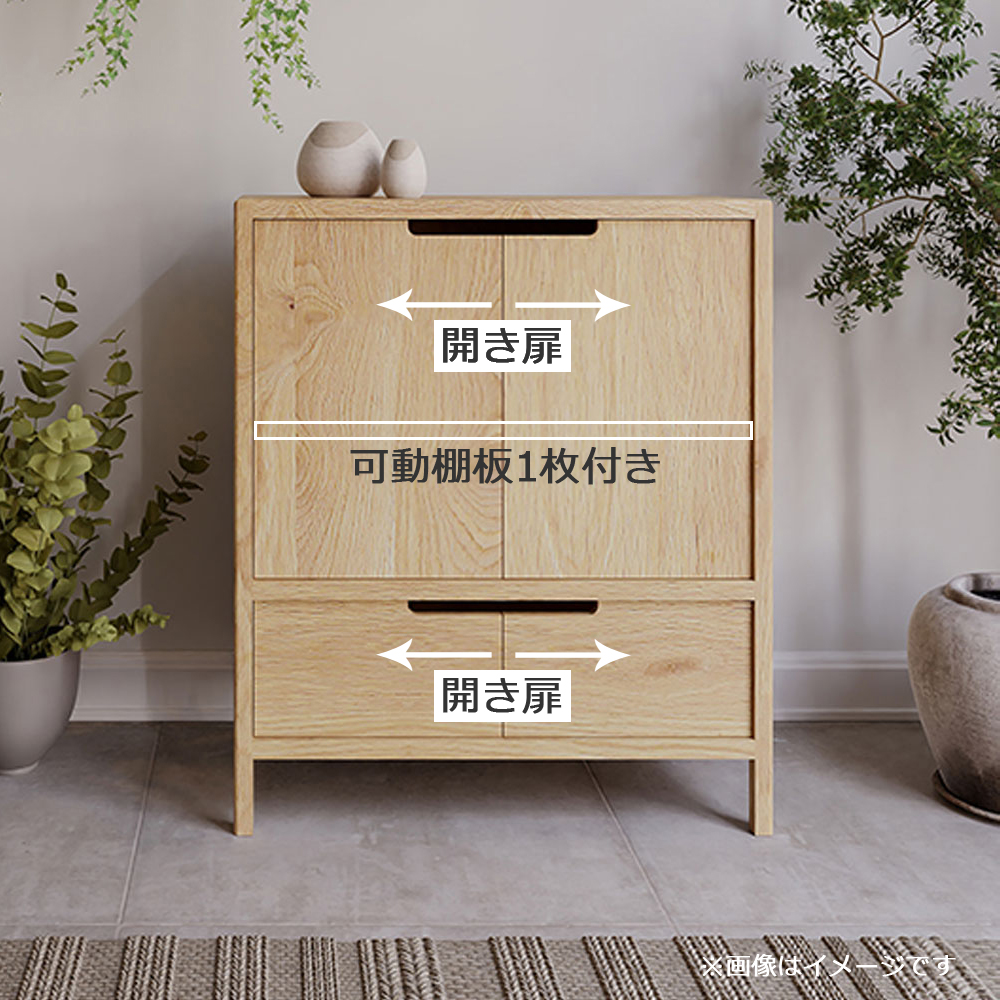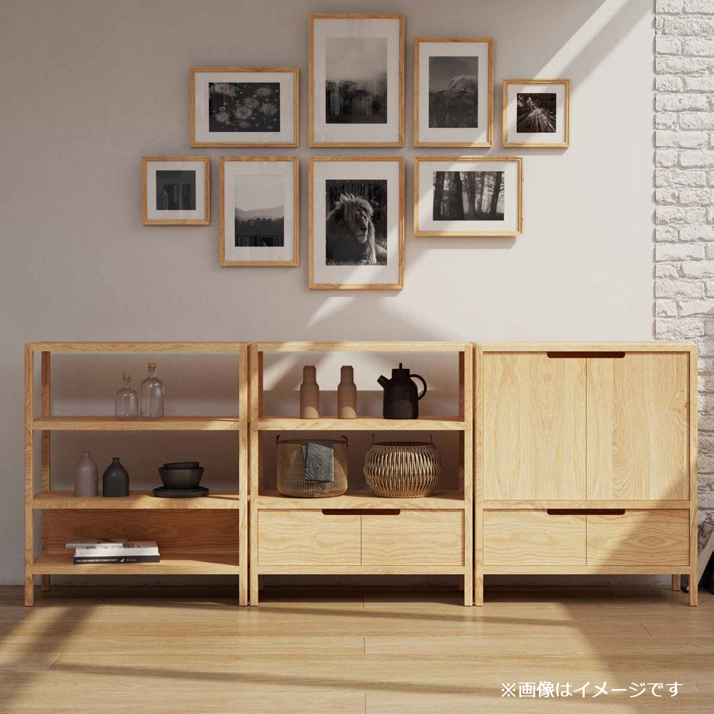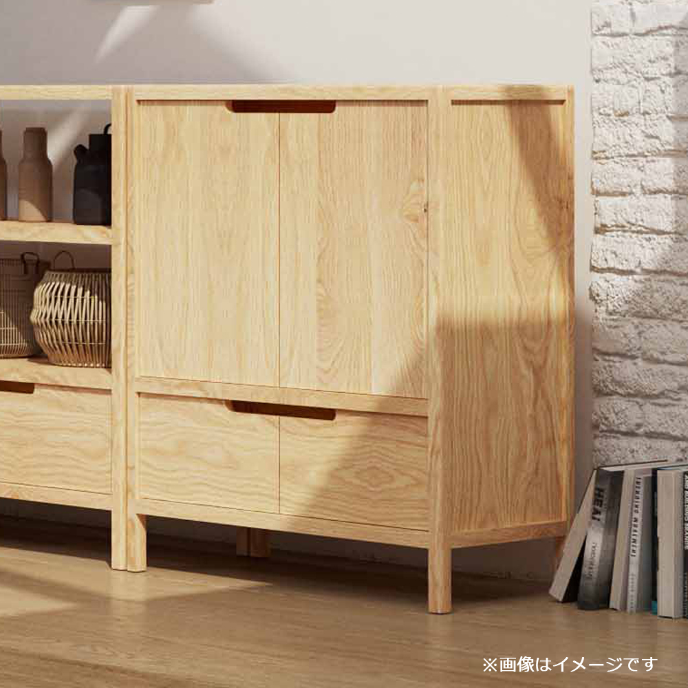 シンプルなデザインで天然木の美しい木目と優しい風合いが魅力的なシェルフ。収納力抜群の扉付き収納で散らかりがちな小物や書類等を整理できます。