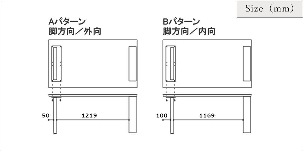 中央にカトラリートレイを配置。取外しができお手入れも簡単に行えます。片脚には収納機能を備えたエンドボックス脚デザイン。エンドボックス脚の向きは外向き・内向きどちらにも対応しています。※片側はスクエア脚/ブラック色となります。