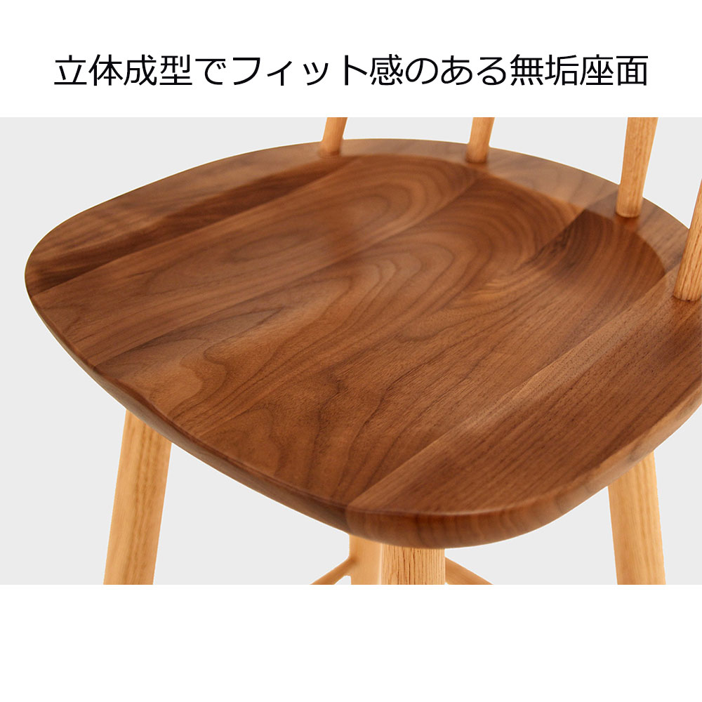 チェア脚の貫部分には足を置くことができ、カウンターチェアながら安定してゆったりと座っていただけます。足かけは2段階の高さがあるので、座面を回転することでお好みの高さを選べます。