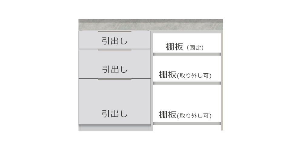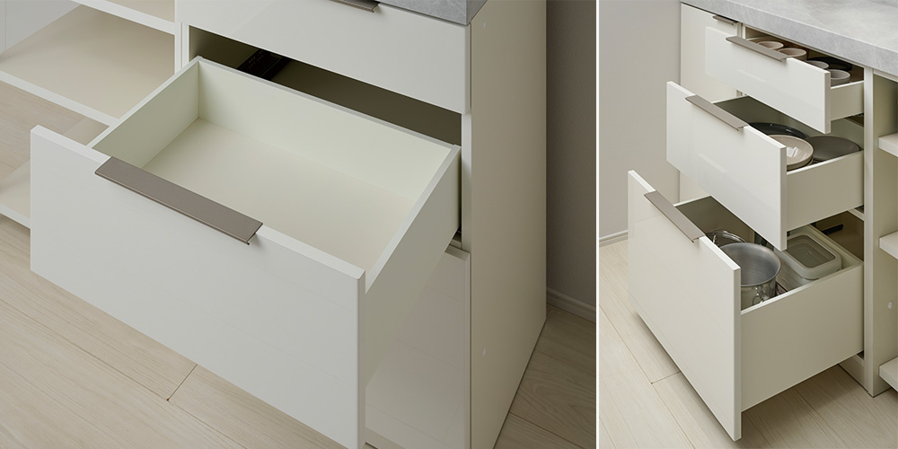 奥の物まで見渡すことができ、収納に便利なフルスライド引出し3杯付きです。深さもバリエーションがあり、用途に合わせて収納できます。(ソフトクローズ仕様)