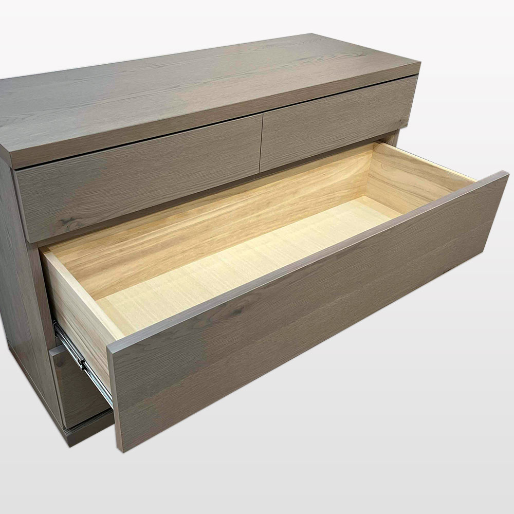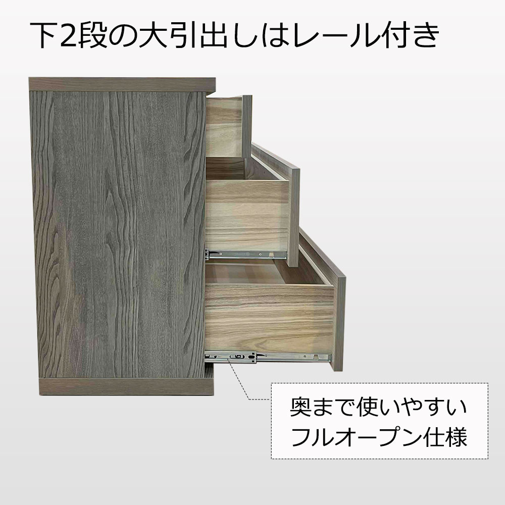 2・3段目の大引出しはフルオープンレール仕様。開閉もスムーズで引出しの奥まで収納物の出し入れが楽にできます。シンプルなデザインを際立たせる隠し引き手になっており、前板底のくぼみに手をかけて楽に引き出すことができます。