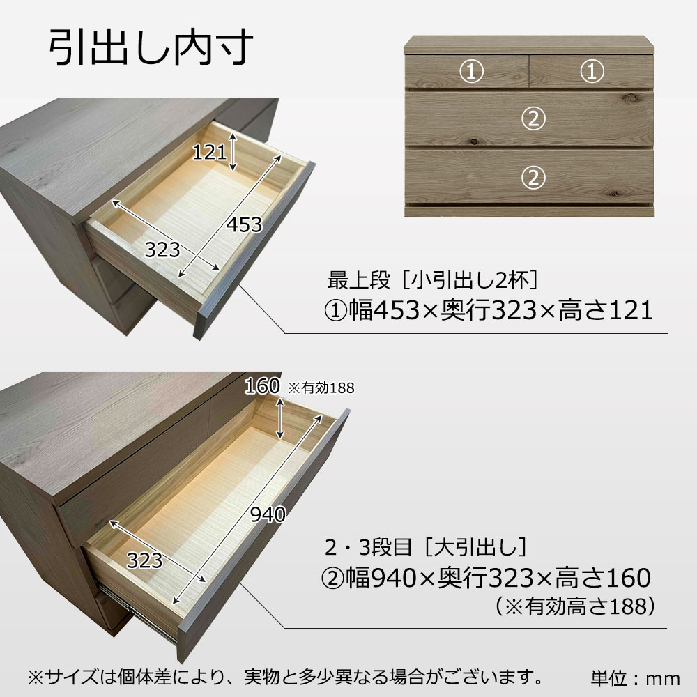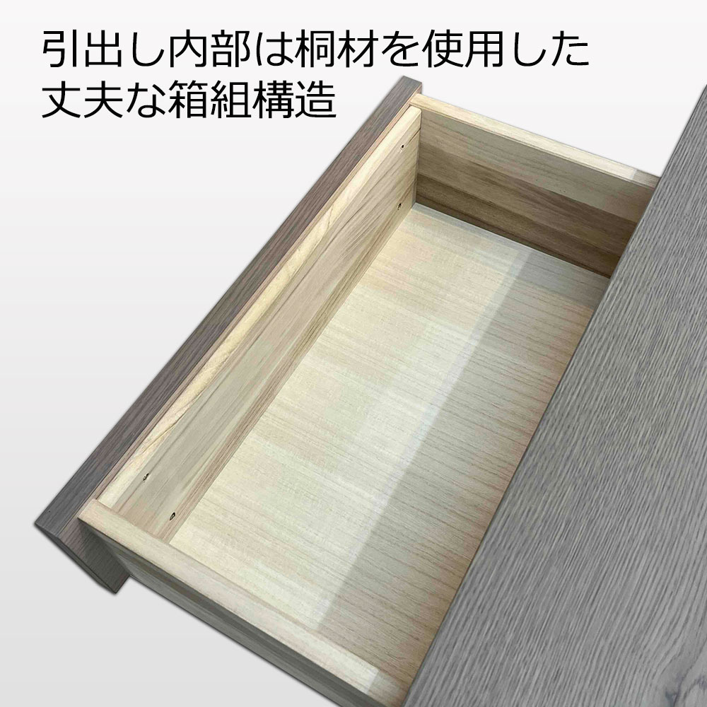 最上段の小引出し2杯と2・3段目の大引出し2杯で、小物や衣類の仕分け収納に便利です。引出しの内箱は桐材を使用しており、丈夫な箱組構造で衣類等の収納物を湿気から守ります。※表記サイズは、個体差のため実際と異なる場合があります。