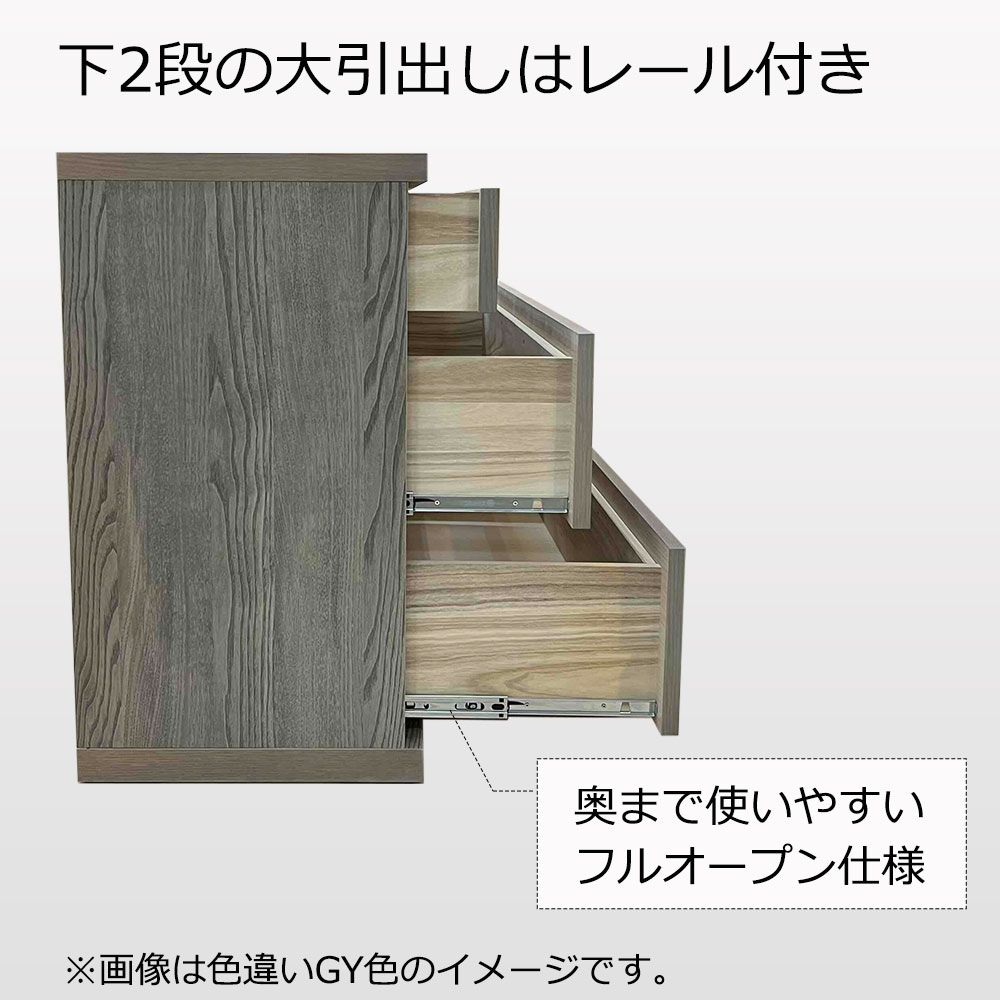 2・3段目の大引出しはフルオープンレール仕様。開閉もスムーズで引出しの奥まで収納物の出し入れが楽にできます。シンプルなデザインを際立たせる隠し引き手になっており、前板底のくぼみに手をかけて楽に引き出すことができます。