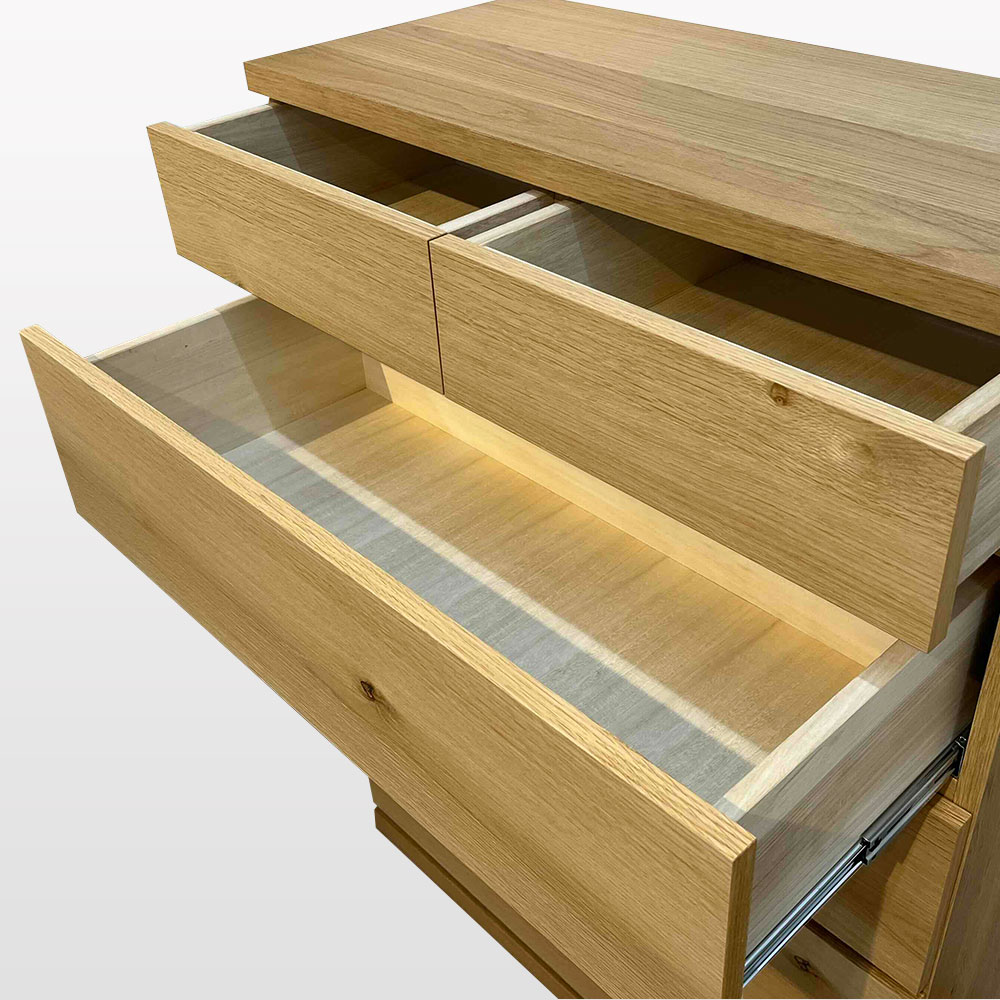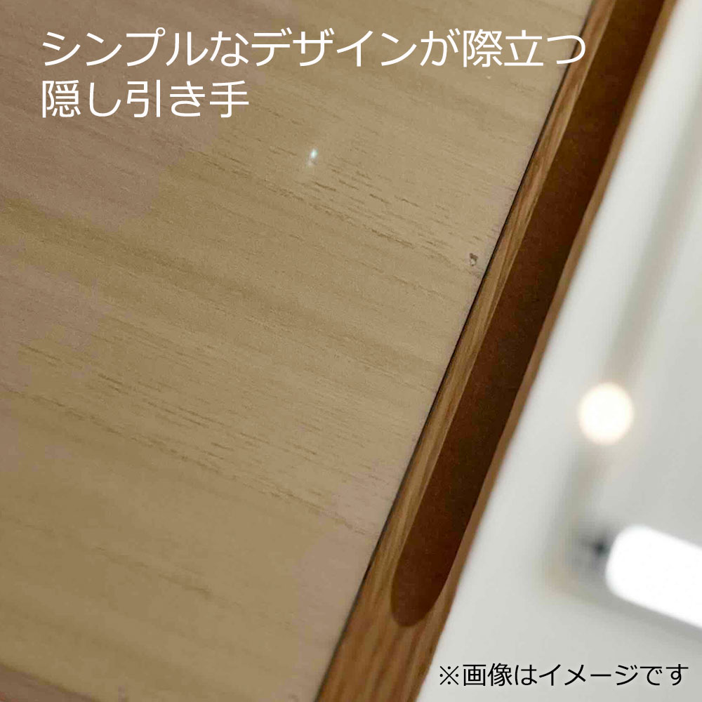 2〜5段目の大引出しはフルオープンレール仕様。開閉もスムーズで引出しの奥まで収納物の出し入れが楽にできます。シンプルなデザインを際立たせる隠し引き手になっており、前板底のくぼみに手をかけて楽に引き出すことができます。