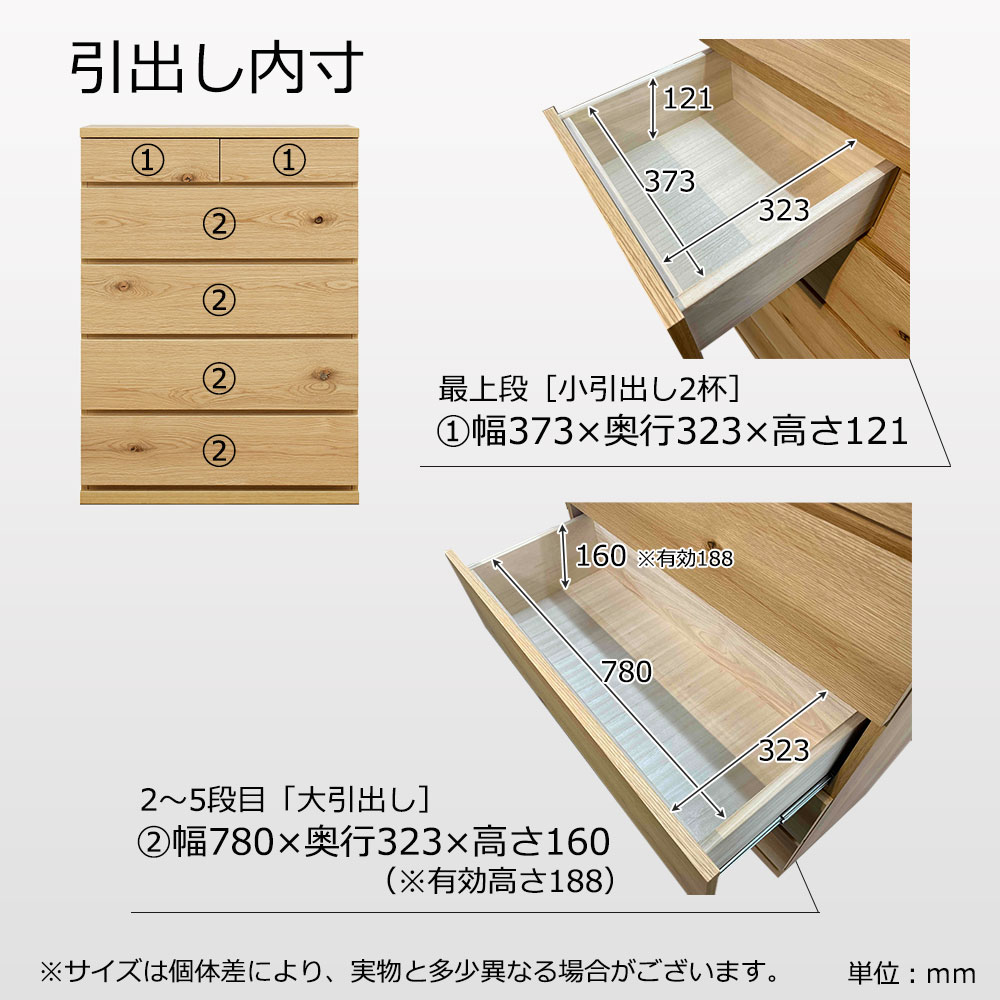 最上段の小引出し2杯と2〜5段目の大引出し4杯で、小物や衣類の仕分け収納に便利です。引出しの内箱は桐材を使用しており、丈夫な箱組構造で衣類等の収納物を湿気から守ります。※表記サイズは、個体差のため実際と異なる場合があります。
