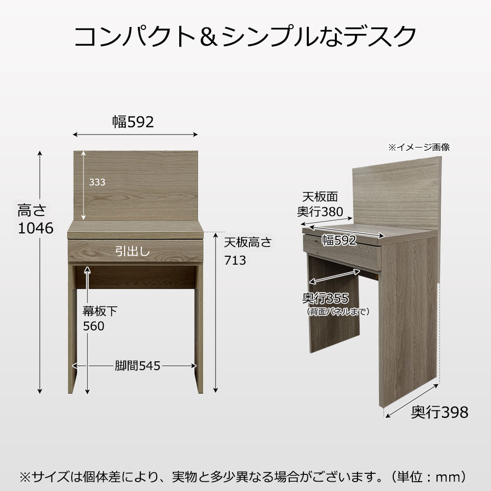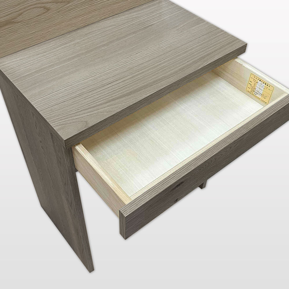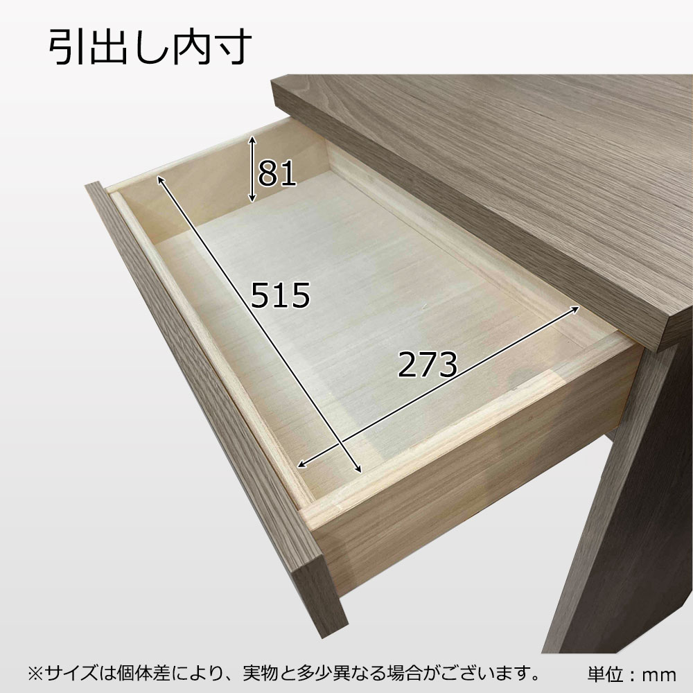 天板と引出し前板に節入りのホワイトオーク材突板を使用しており、表情豊かな木目を活かしつつシックな空間にも合わせやすいグレー色に仕上げています。