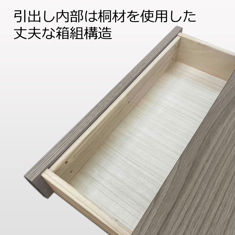 デスク周りの小物を収納できる引出し1杯付きです。引出しの内箱は桐材を使用しており、丈夫な箱組構造で収納物を湿気からも守ります。