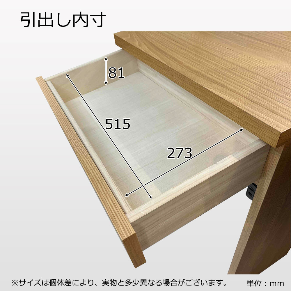 天板と引出し前板に節入りのホワイトオーク材突板を使用しており、表情豊かな木目がナチュラルで明るい空間を演出します。