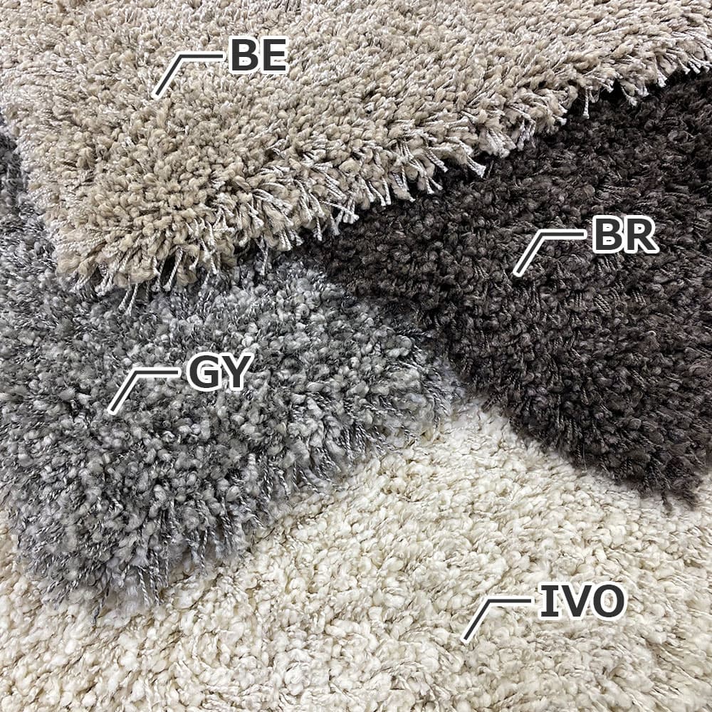 お部屋に馴染みやすい、IVO(アイボリー)・BE(ベージュ)・グレー(GY)・ブラウン(BR)の4色展開です。床の色やインテリアのテイストに合わせてお選びいただけます。パイルアップの画像の為、大きなラグサイズになると明るい印象になります。