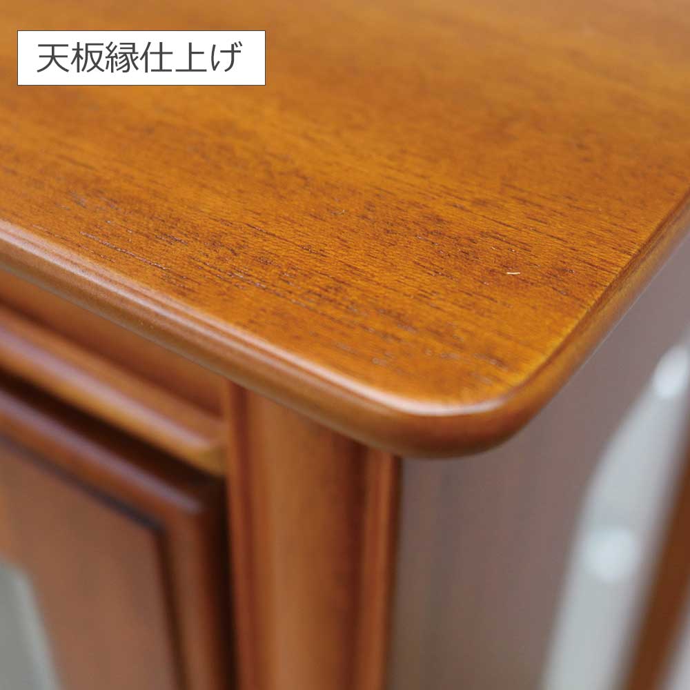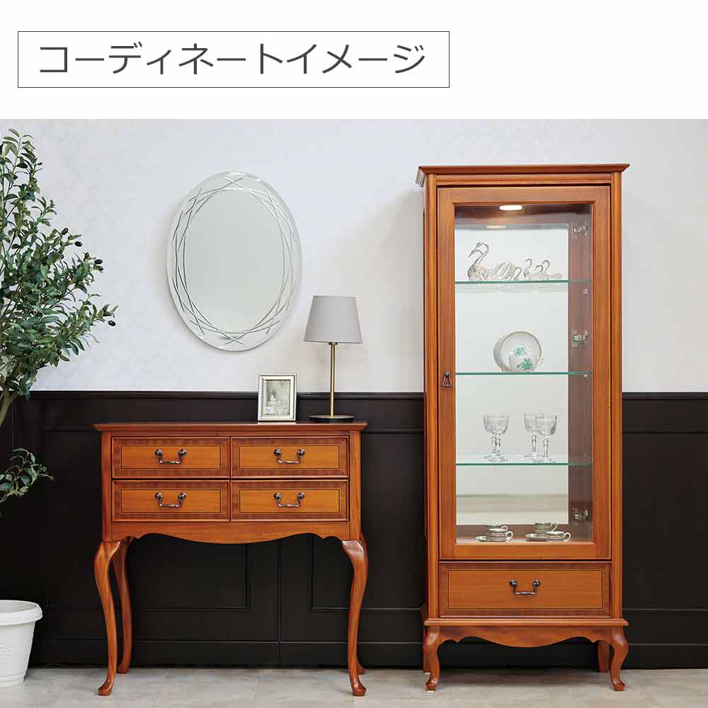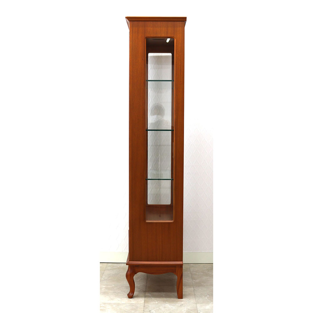 クイーンアン様式を基調とした、優しい木肌のマホガニー材を活かしたシックで高級感のあるシリーズ「ブライトン」。ミディアムブラウンに仕上げた明るく上品な色合いとフォルムが魅力のクラシカルデザインのキュリオケースです。奥行35cmの省スペース設計で、厚さ8mmのガラス棚が3枚セットされており、収納物に合わせて高さ調節が可能。把手は真鍮製のアンティーク仕上げで上品な印象です。