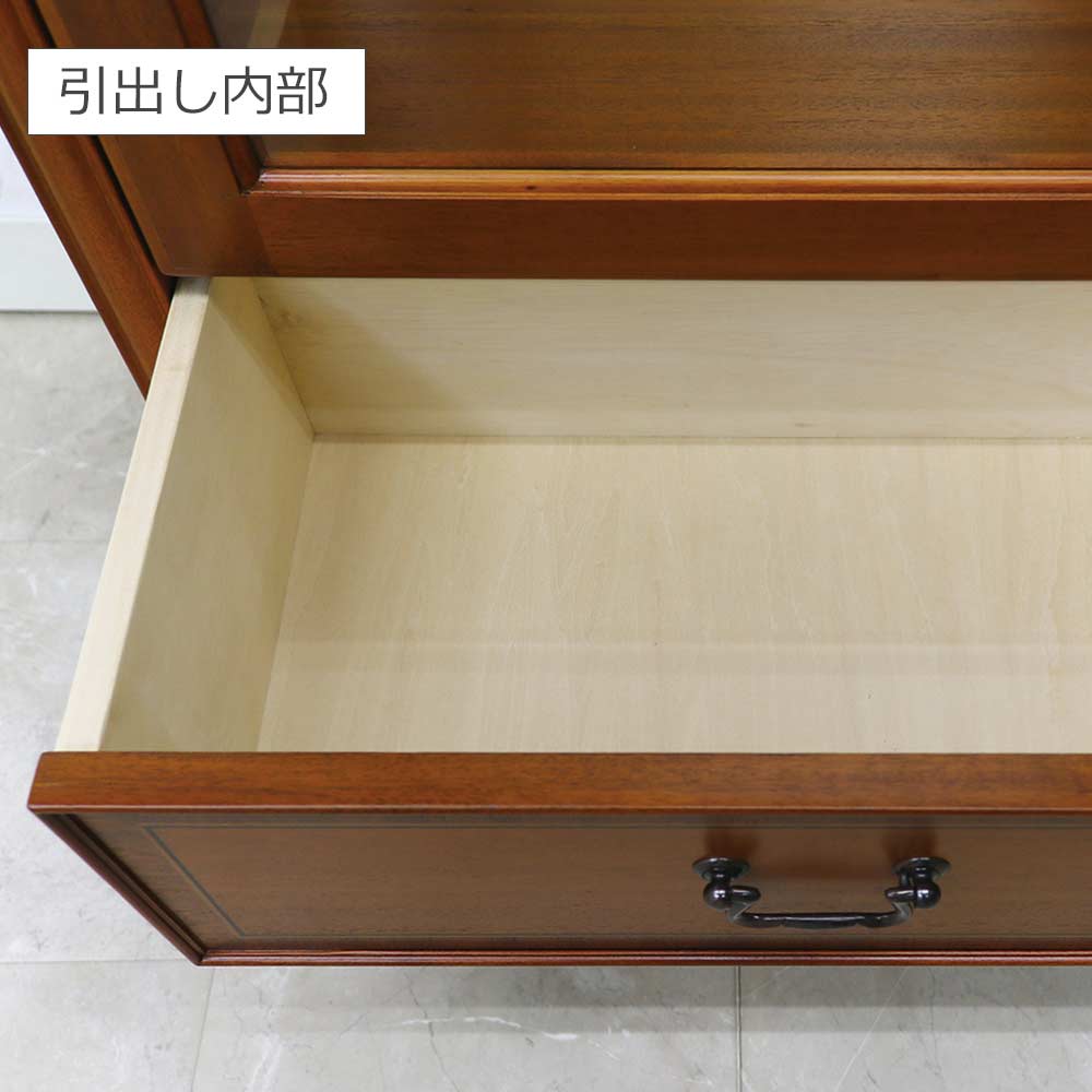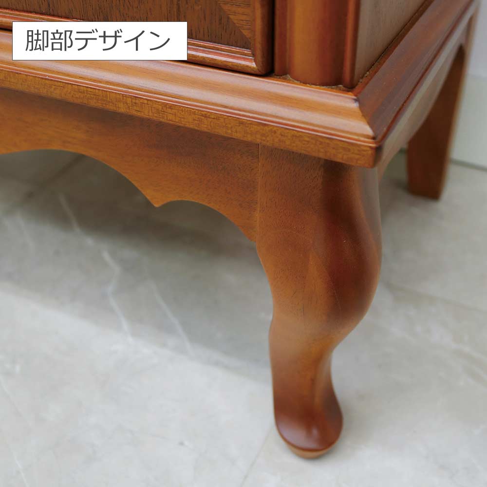 引出し前板にはマホガニー柾目とサペリ材柾目の突板で模様貼りを施しており、前脚の猫脚スタイルなど、細やかなデザインがクラシカルな雰囲気を高めます。