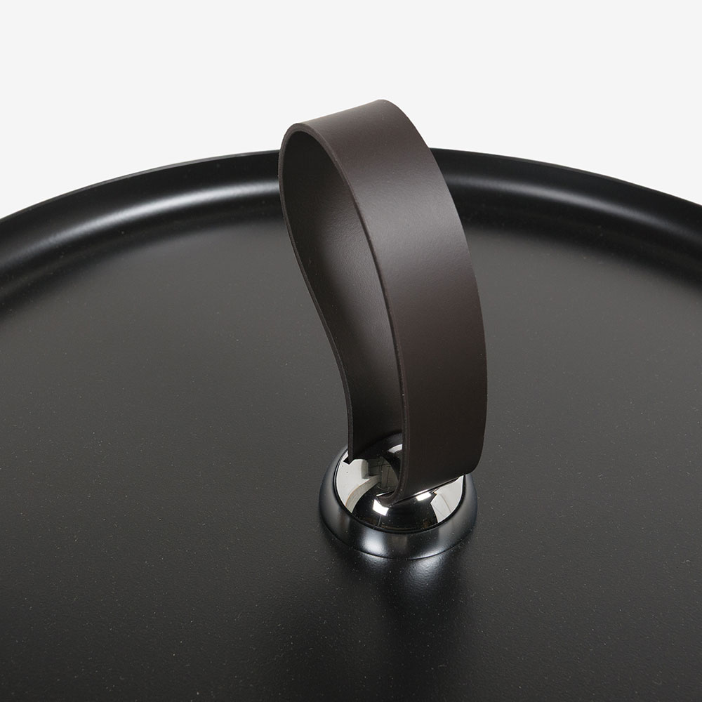 ブラックカラーのスチール天板と脚部のオーク材、そして取っ手のレザーと、異なる素材の質感が活かされたデザインです。スタイリッシュな存在感で、空間のアクセントになります。