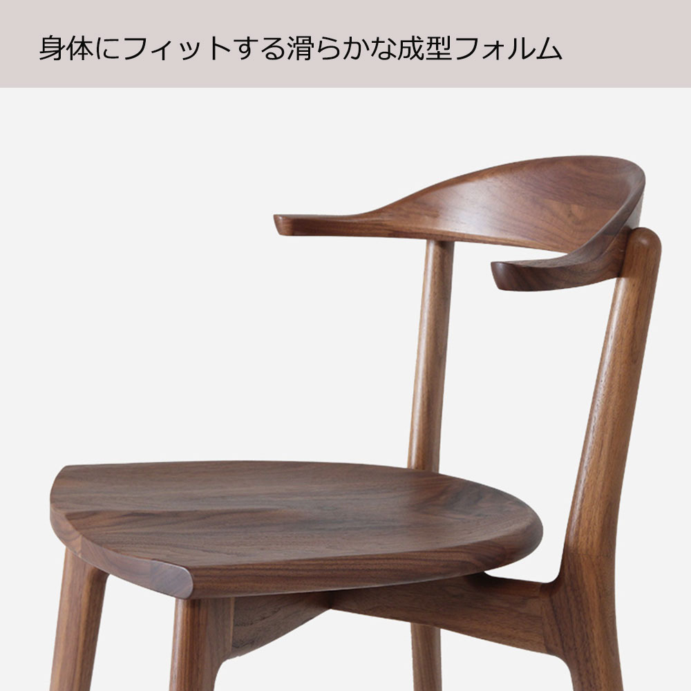 一体成型で削り出された背もたれとアームは、ゆるやかなカーブが心地よく身体を支え、手触りも滑らかな仕上がりとなっています。座板を立体成型にすることにより、お尻へのフィット感が増し、長時間座っても疲れにくく快適な座り心地を実現しています。