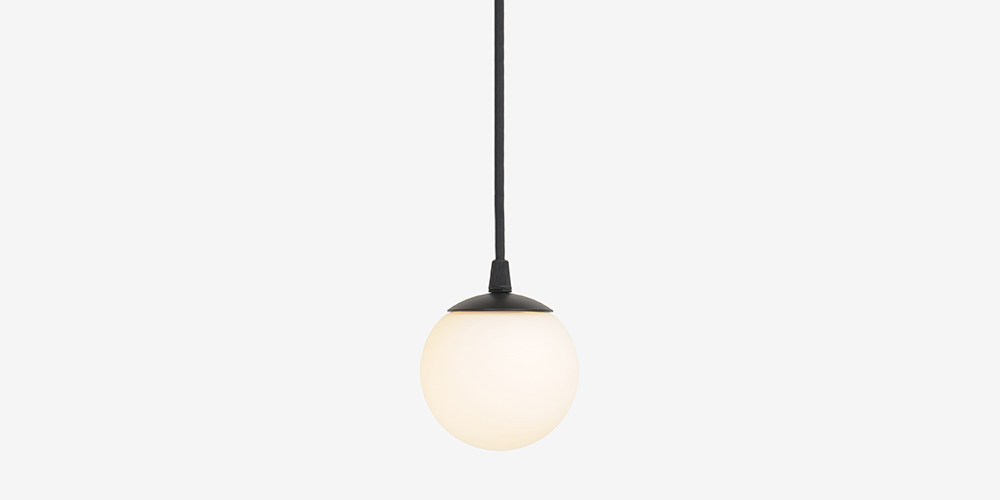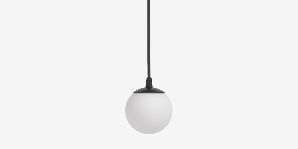 繊細な球体型ガラスセードに、シックな印象の黒色銅製ソケットパーツを組合わせたペンダントライト。吊るす場所を選ばないミニマルなデザインが魅力です。フロストガラスのセードにより、柔らかな灯りが空間に広がります。