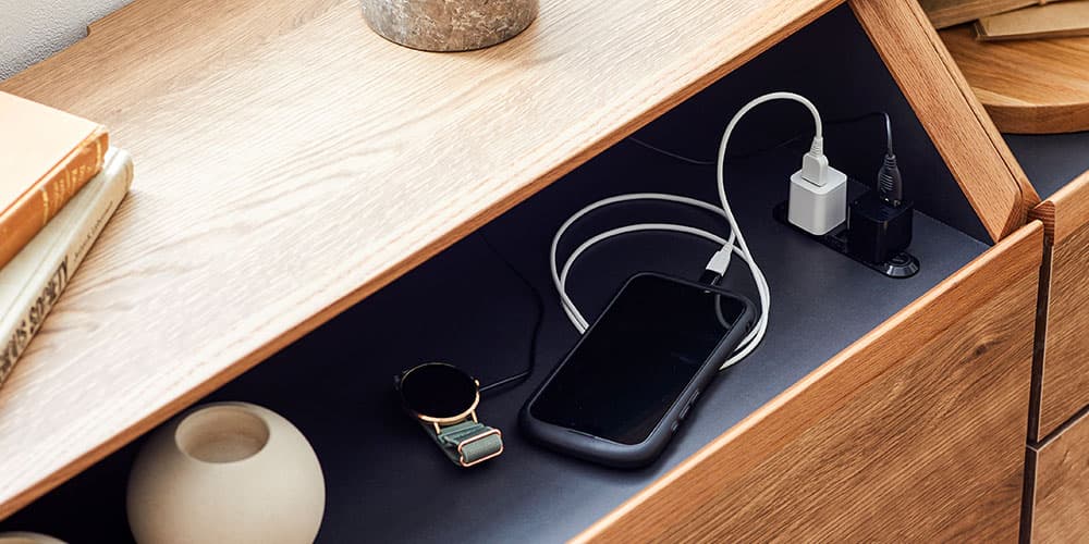 天板下は充電などに便利な2口コンセント(スライド式)付き。内部は落ち着いたダークグレー(全カラー共通)でディスプレイスペースとしても活用できます。
