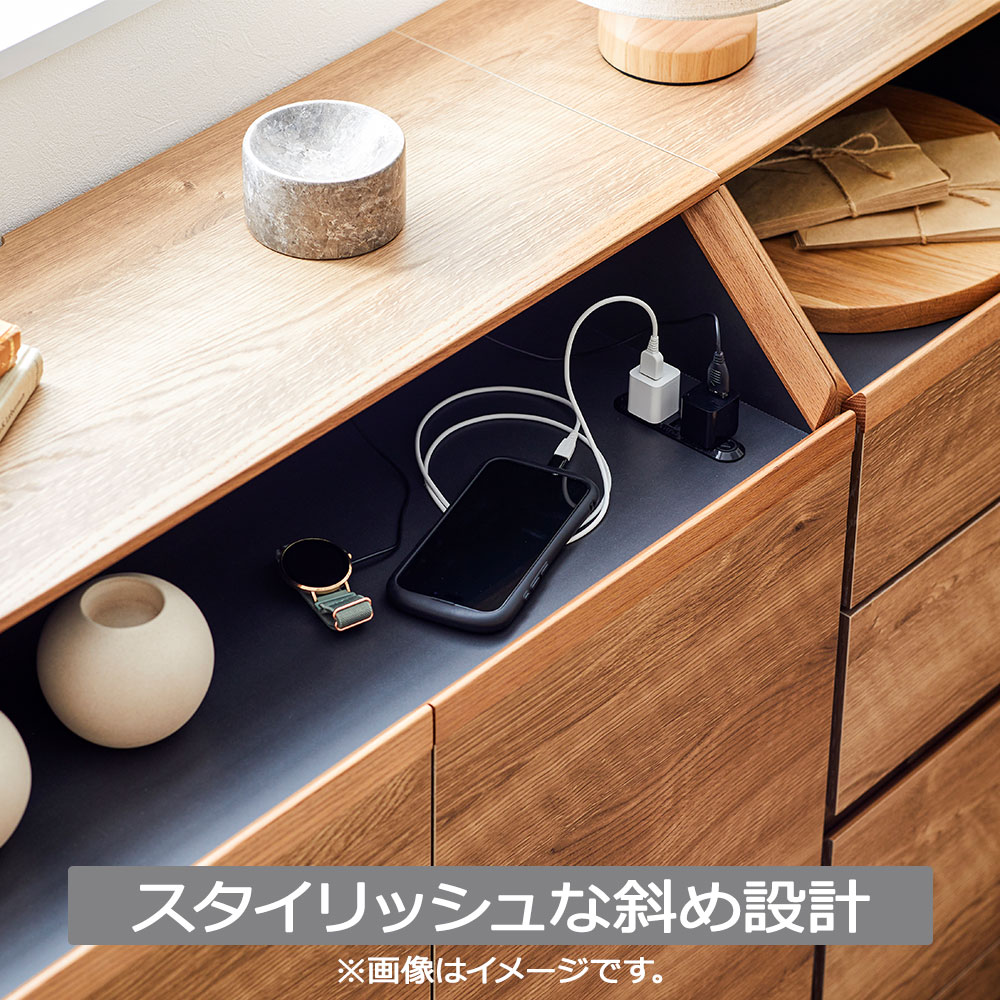 スタイリッシュな斜め設計のデザインが印象的なサイドボード。コンセント付きでスマートに充電できるオープンスペースが魅力です。天板が引っ込んでいる事でカウンター下収納としても使いやすいデザインです。
