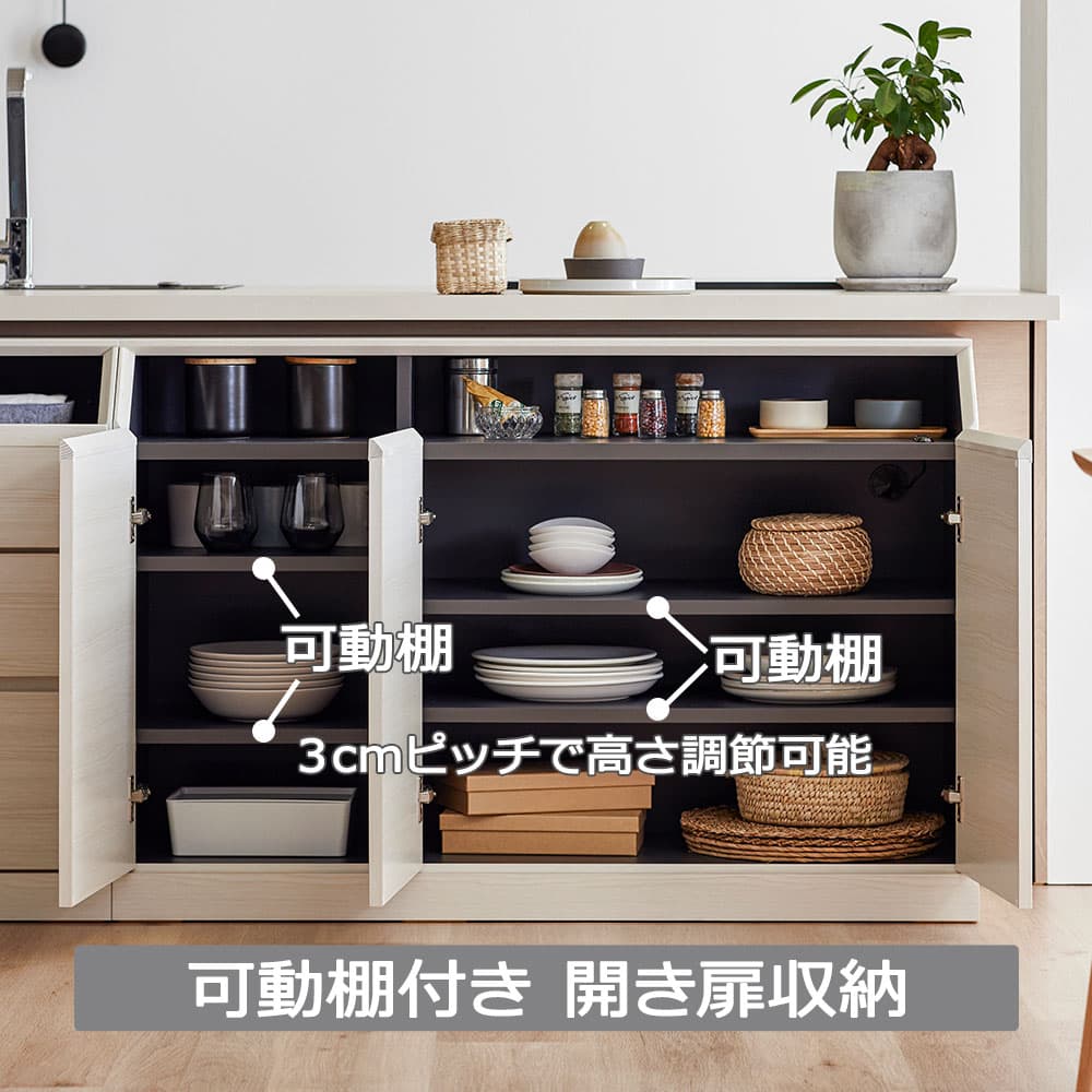収納するものに合わせて3cmピッチで高さ調節できる可動棚付き、開き扉収納です。扉で隠すことができるのですっきり収納できます。
