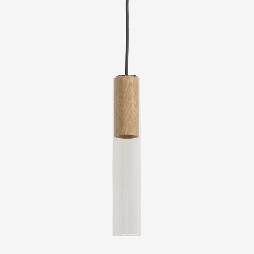 ナラ無垢材を円柱状に削り出して仕上げた、ミニマルで美しいデザインのペンダントライトです。異素材のガラスと組合わせることで、シンプルながらも個性的な印象を与えます。無垢材ならではの温かみを感じられるだけでなく、長くお使いいただくことで天然木の経年変化もお楽しみいただけます。