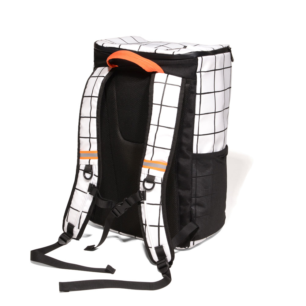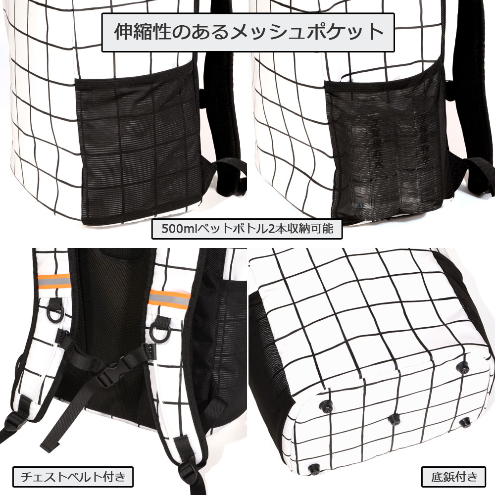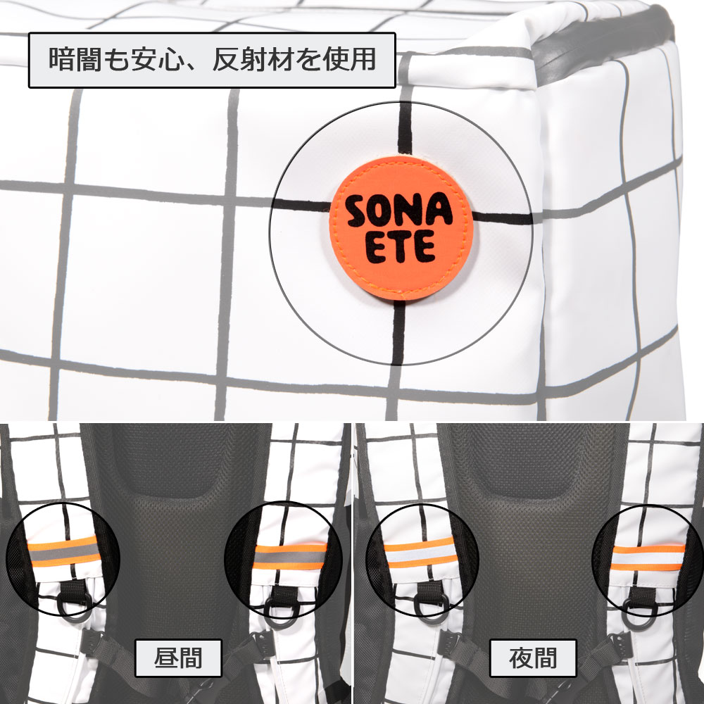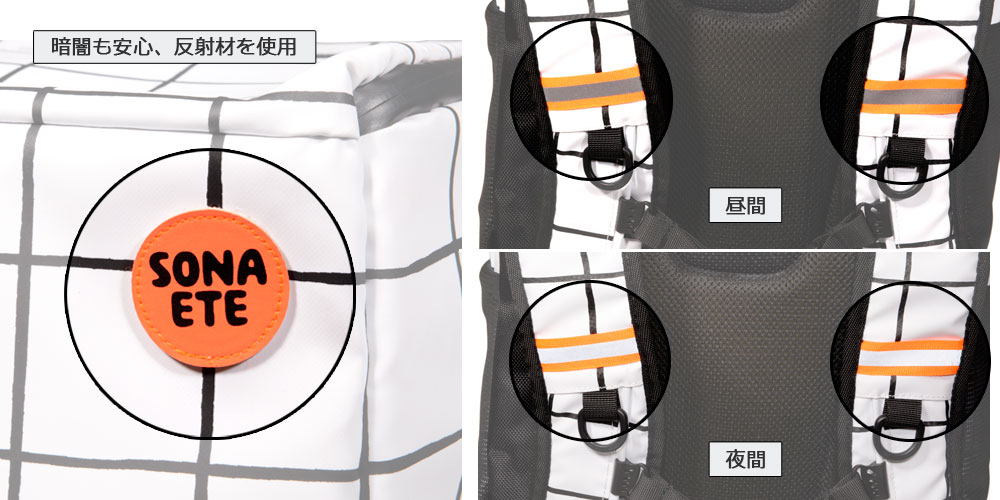 夜間の移動が安全にできるよう、肩紐の両側(胸のあたり)と、ロゴワッペンに反射板がついています。