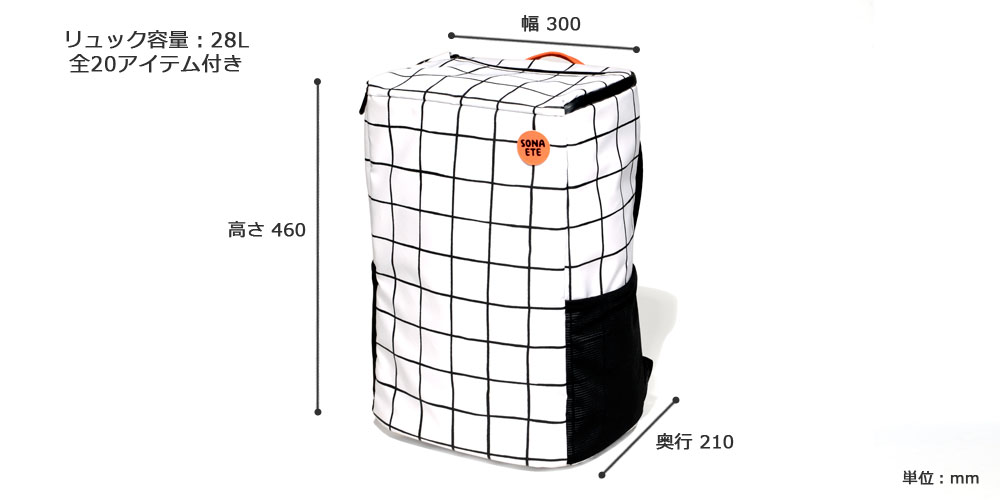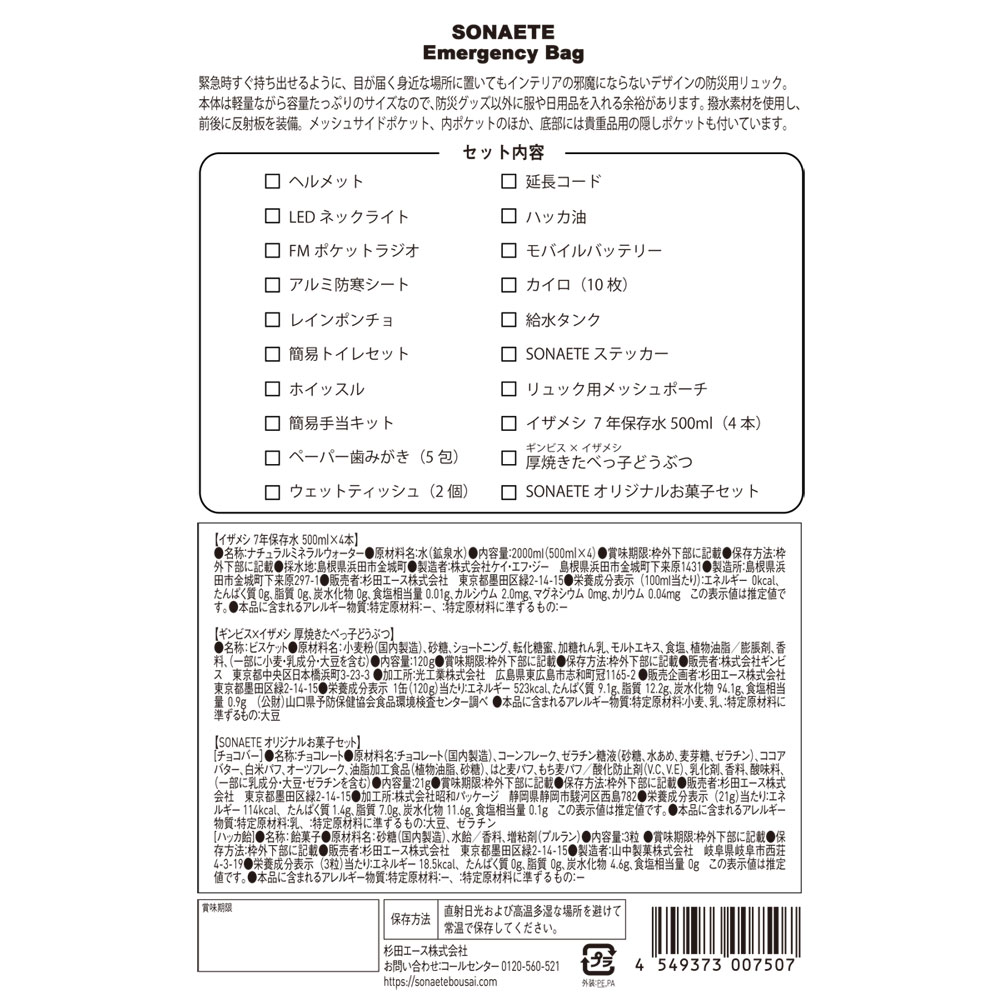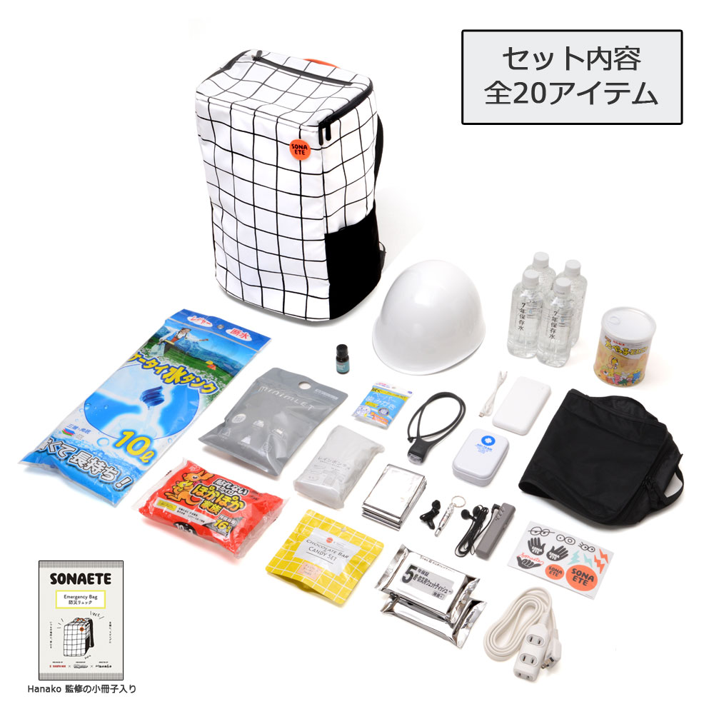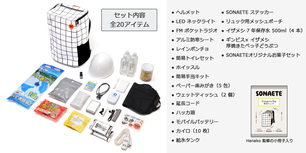 ヘルメット、LED ネックライト、FM ポケットラジオ、アルミ防寒シート、レインポンチョ、簡易トイレセット、ホイッスル、簡易手当キット、ペーパー歯みがき(5 包)、ウェットティッシュ(2 個)、延長コード、ハッカ油、モバイルバッテリー、カイロ(10 枚)、給水タンク、SONAETE ステッカー、リュック用メッシュポーチ、イザメシ 7 年保存水 500ml(4 本)、ギンビス× イザメシ 厚焼きたべっ子どうぶつ、SONAETEオリジナルお菓子セット、Hanako監修の小冊子付き