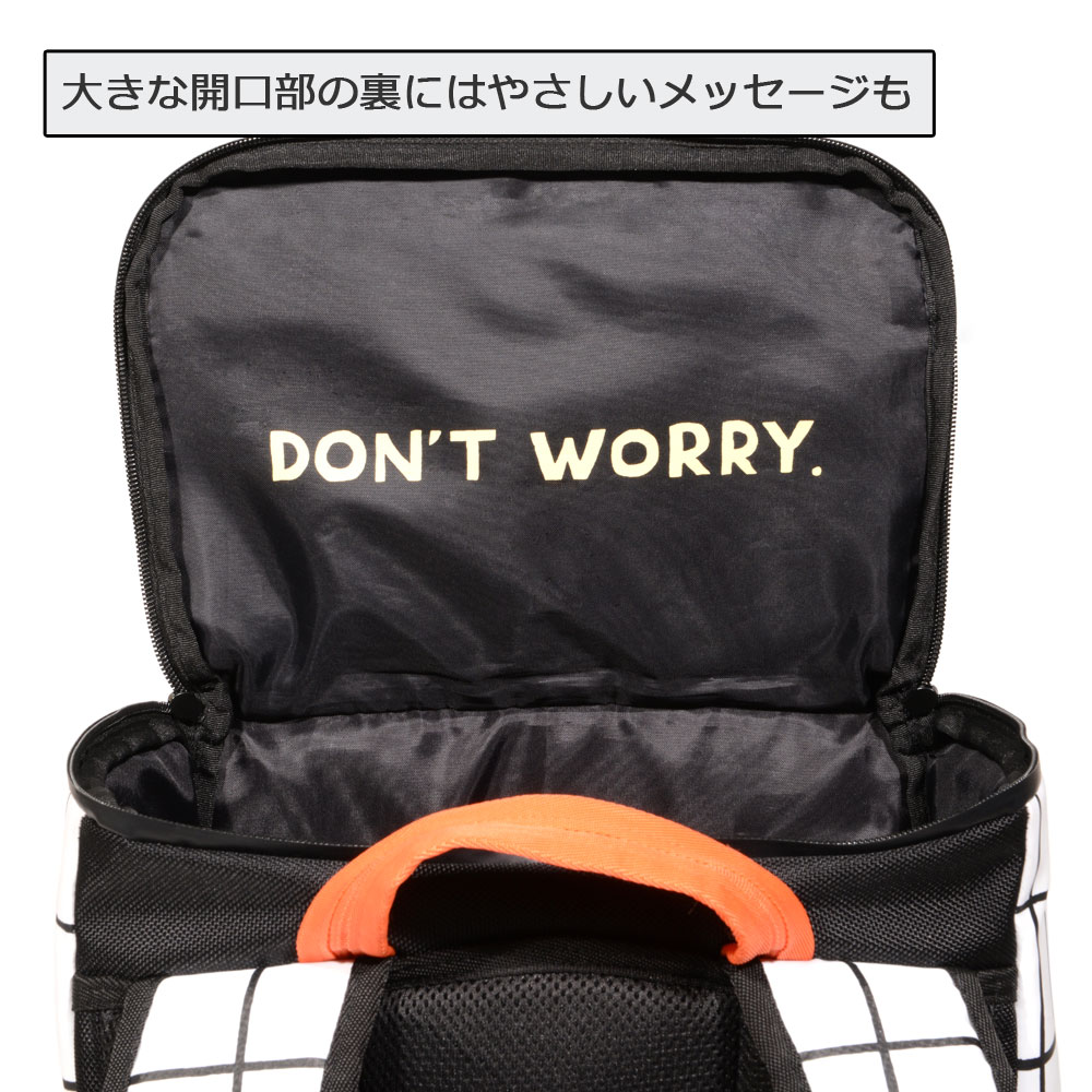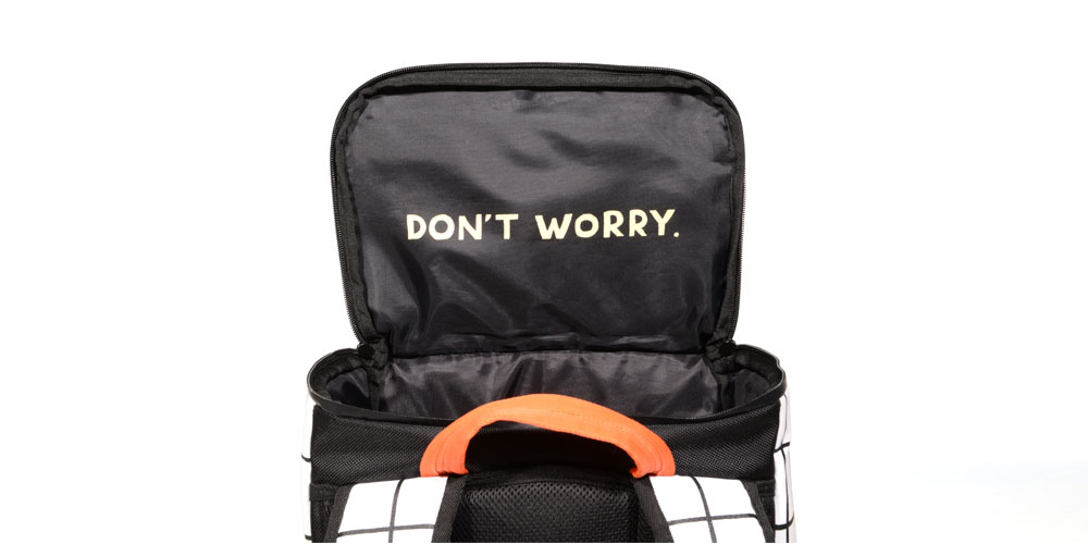 内容物の出し入れがしやすいよう、天面の蓋はファスナーを開いて全開できる仕様に。気持ちが少しでも和らぐように、蓋の裏には「DON’T WORRY.(安心して)」のメッセージも添えられています。