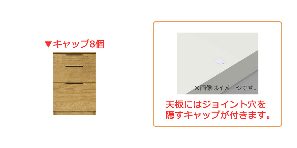 オープンボードの下台のみをカウンターとしてお使いいただく仕様です。そのため、天板には上台とのジョイント穴を隠す樹脂製のキャップが8箇所付きます。シルキーナット色にはホワイト、ラスティックオーク色にはベージュ、グレイッシュナット色・ウォールナット色にはブラックのキャップが付属します。