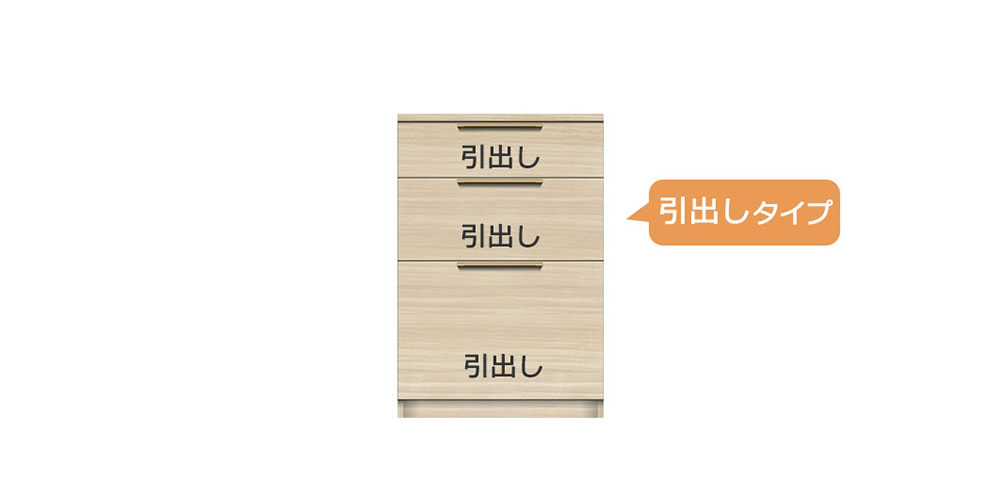 深さの異なる3杯の引出しは用途に合わせて収納できます。引出し内装はラスティックオーク色・シルキーナット色はホワイト、グレイッシュナット色・ウォールナット色はダークグレーです。