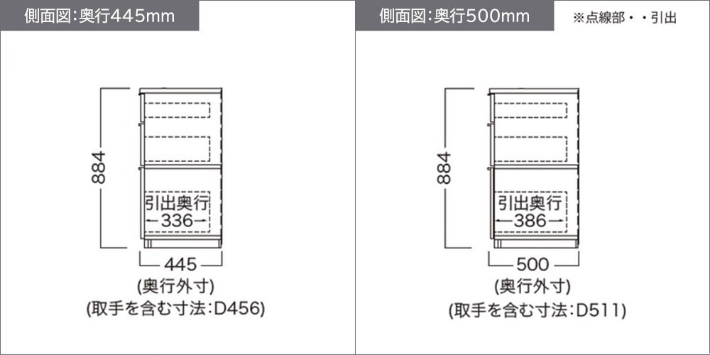 (奥行500mm)引出し:奥行外寸+363mm(引手含む)