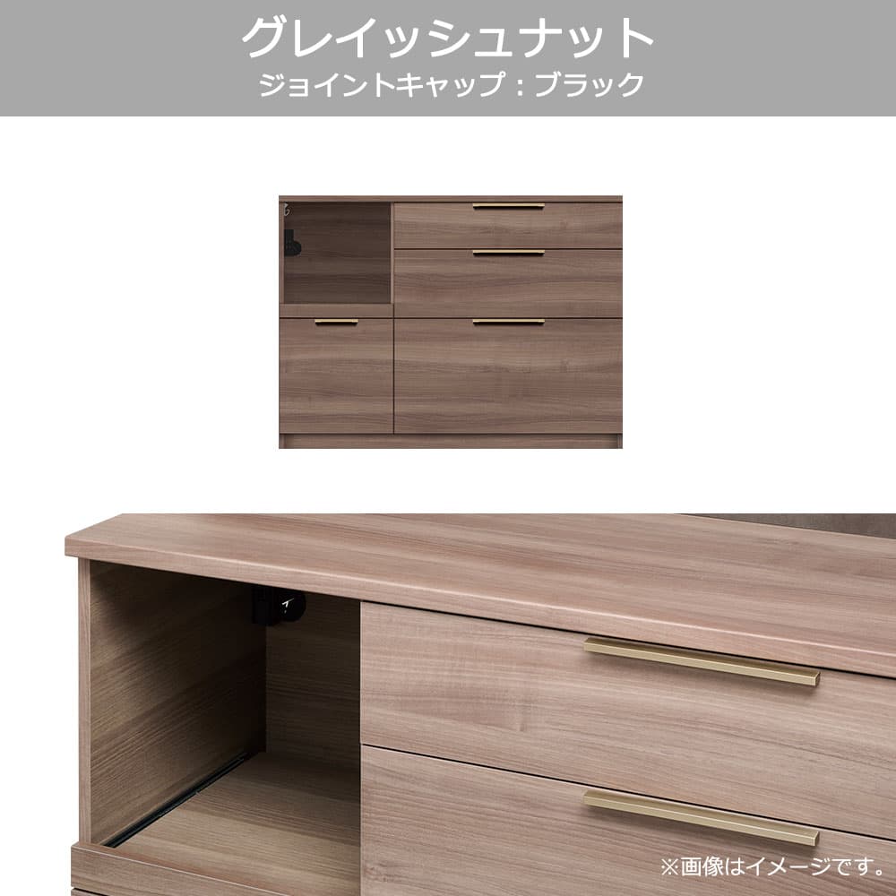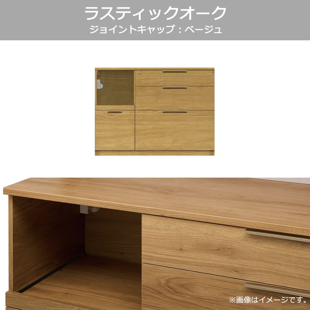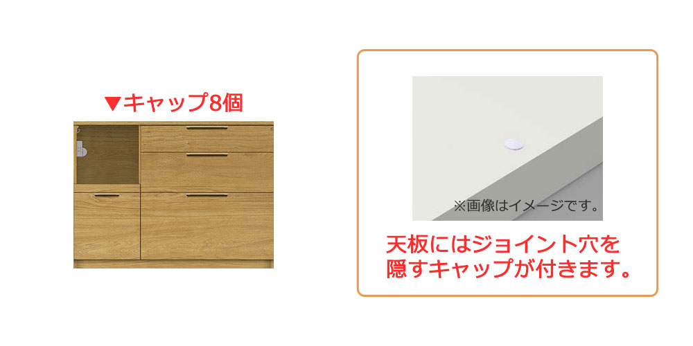 オープンボードの下台のみをカウンターとしてお使いいただく仕様です。そのため、天板には上台とのジョイント穴を隠す樹脂製のキャップが8箇所付きます。シルキーナット色にはホワイト、ラスティックオーク色にはベージュ、グレイッシュナット色・ウォールナット色にはブラックのキャップが付属します。