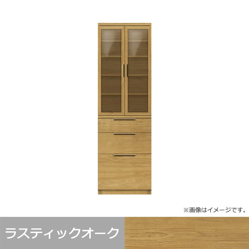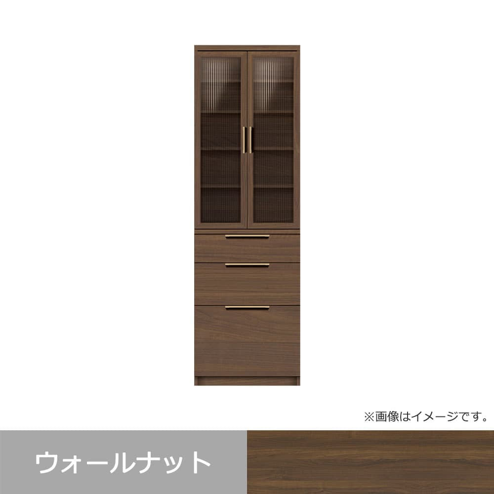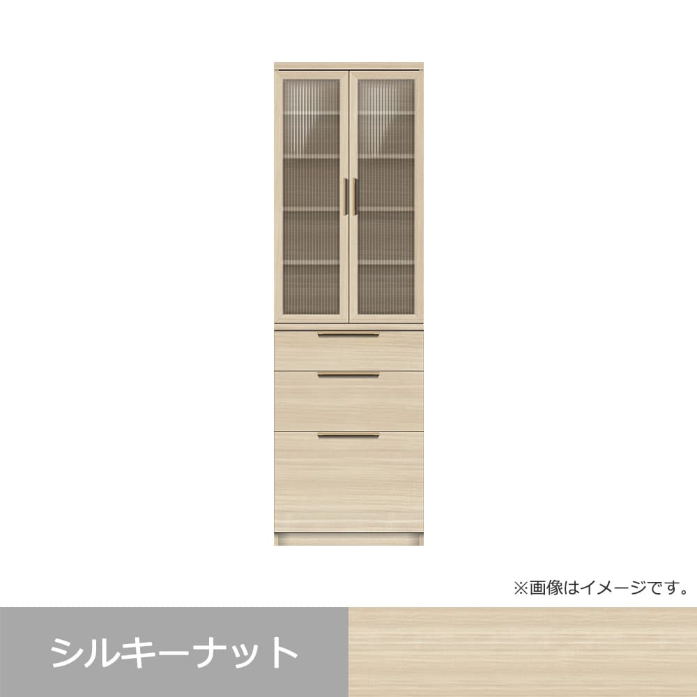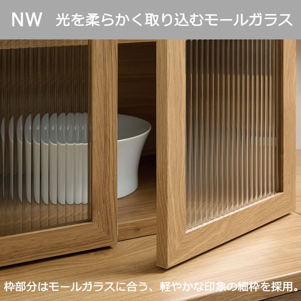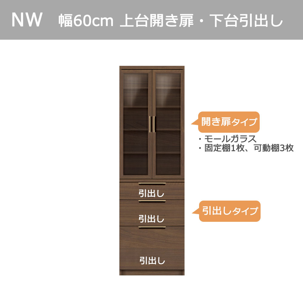 ナチュラルなインテリアに馴染む木目柄で統一されたデザインのNWシリーズ。上台はモールガラスが優しい印象の開き扉タイプ、下台は3段の引出しタイプでたっぷり収納できる幅60cmのサイドアイテムです。